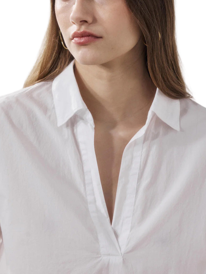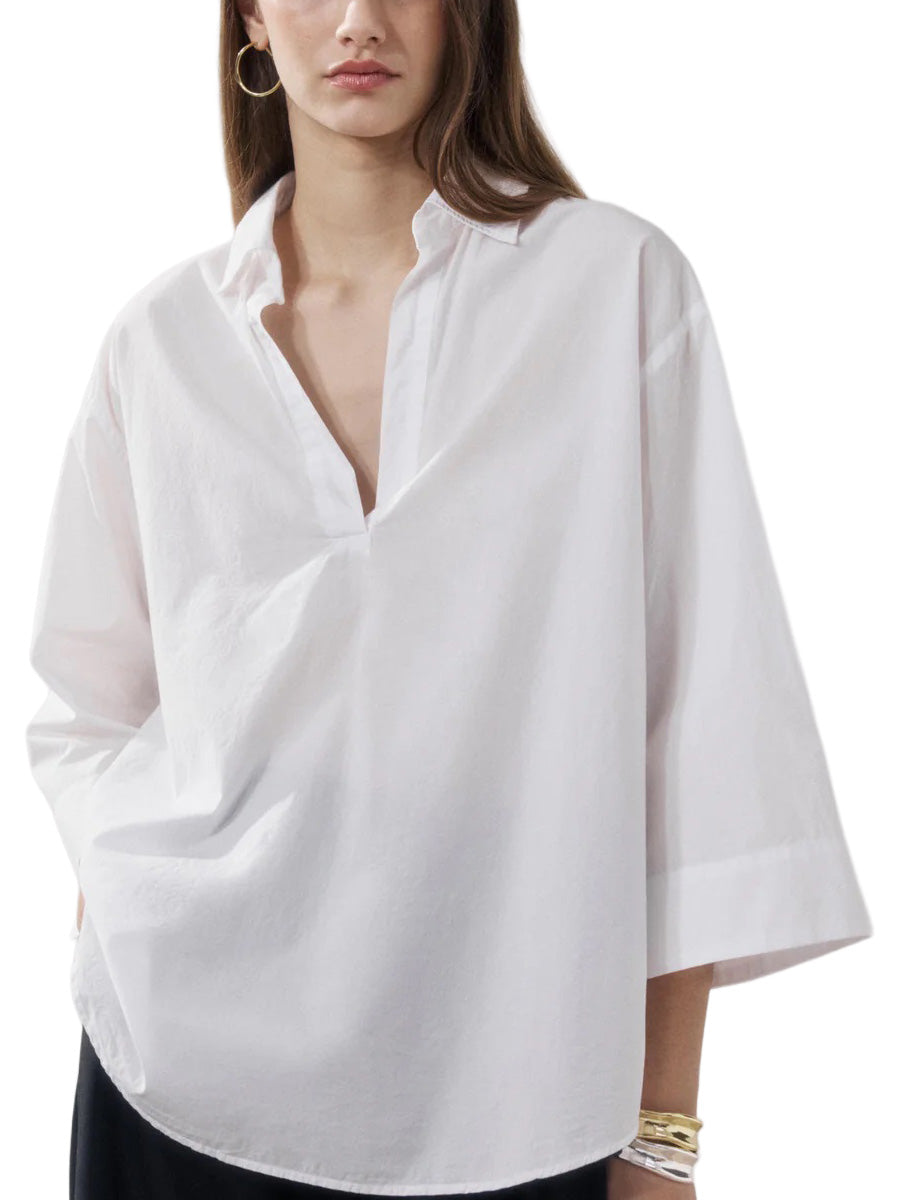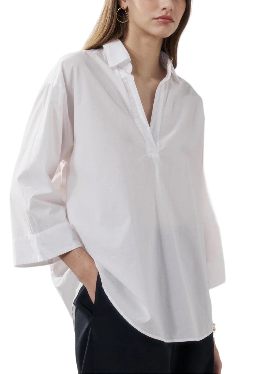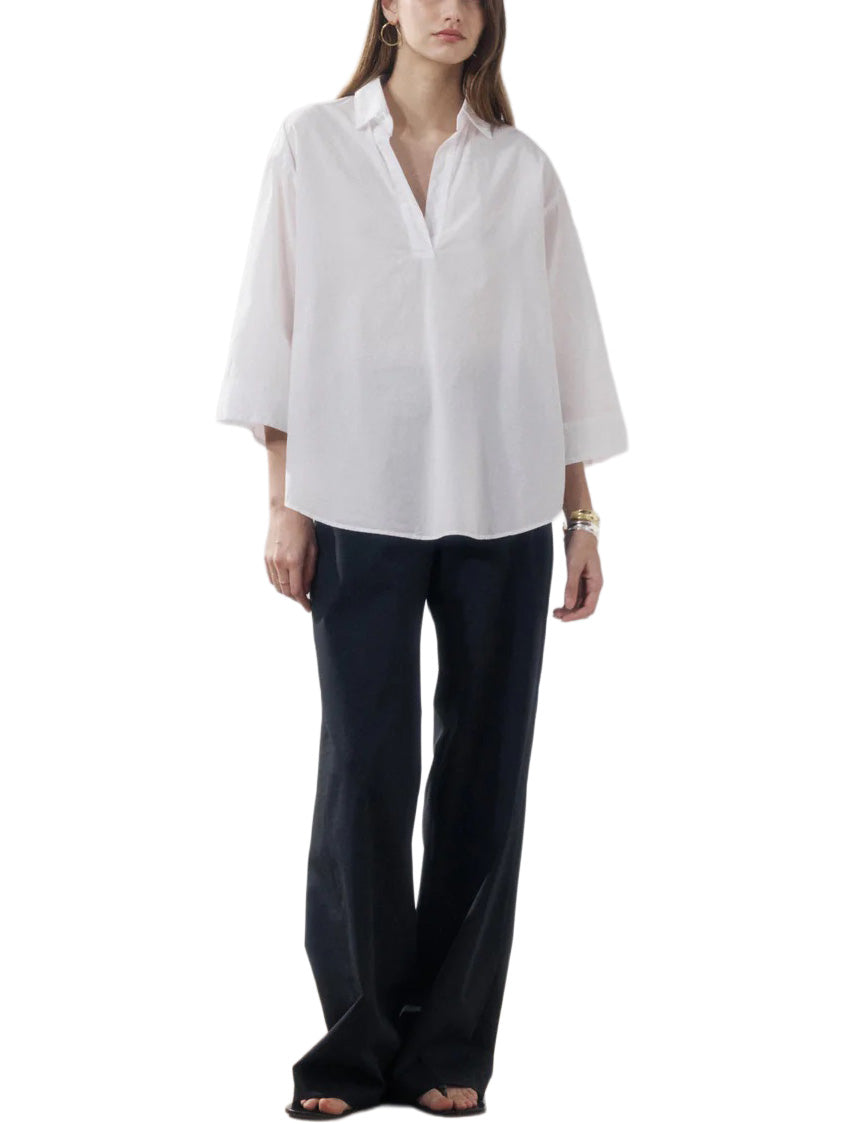 The COLA women's blouse is a resolutely casual piece. Made from Striped Poplin cotton, it takes up the codes of the traditional shirt while adopting a fuller volume. Its structured Fabric, light and comfortable to wear, highlights its generous fit and wide sleeves for a naturally casual yet elegant style.