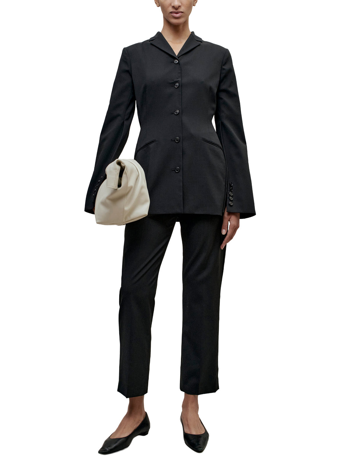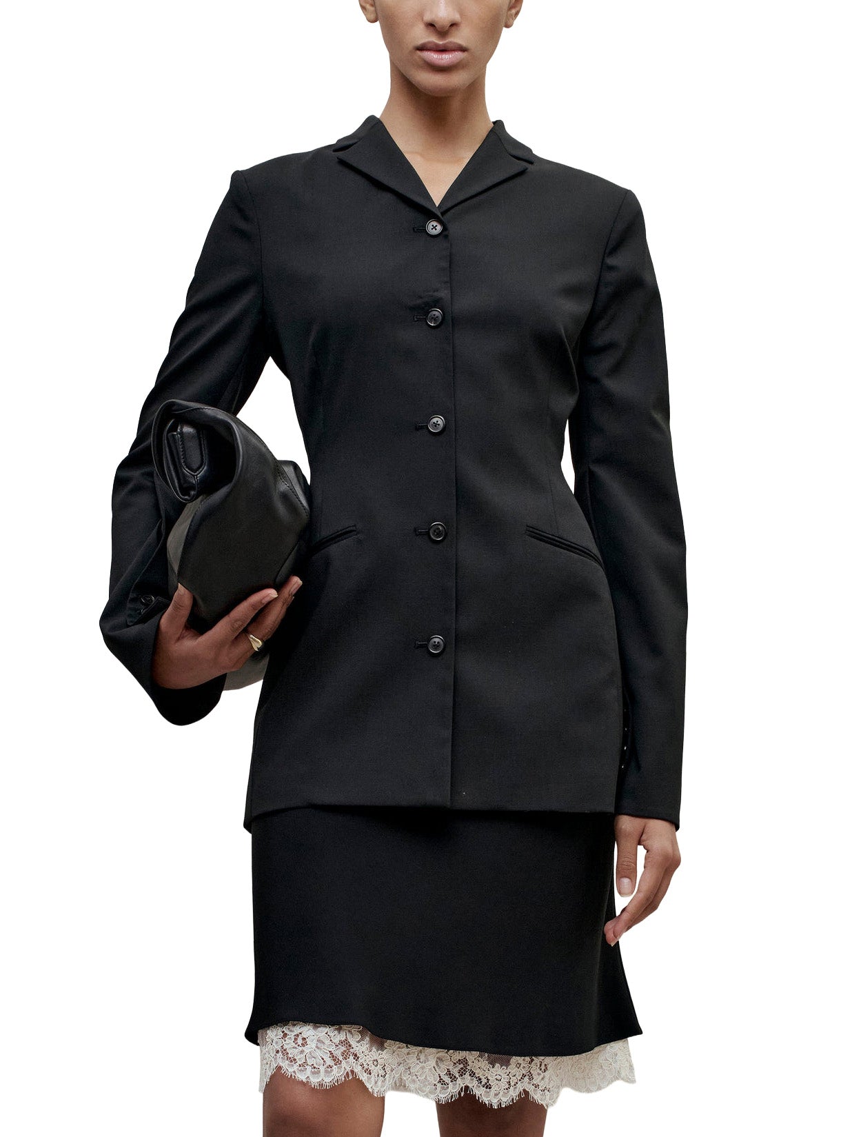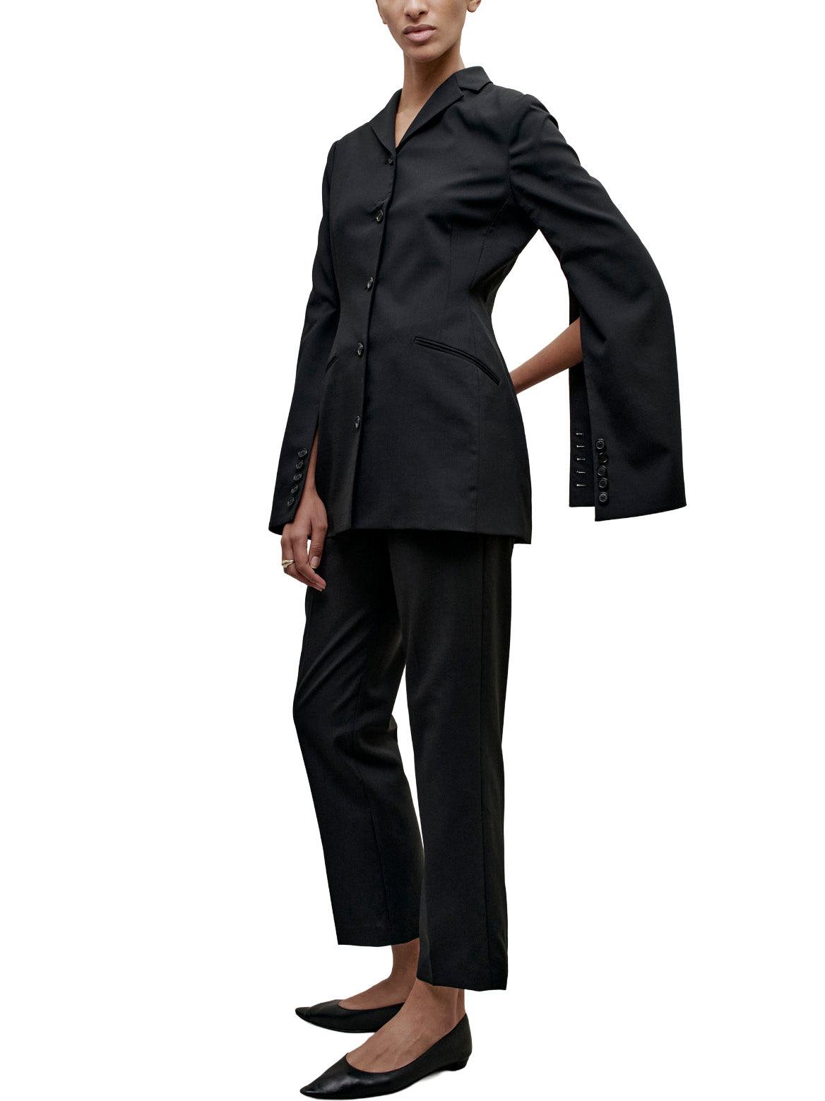 Longline blazer in black tropical wool. Notched lapel with five button front closure. Fitted through body with nipped waist and elongated silhouette. Welt pockets at hips. Long sleeves feature vertical vents with button details at cuffs. Structured tailoring with refined drape. Essential suiting piece that pairs with matching trousers or elevates casual separates.