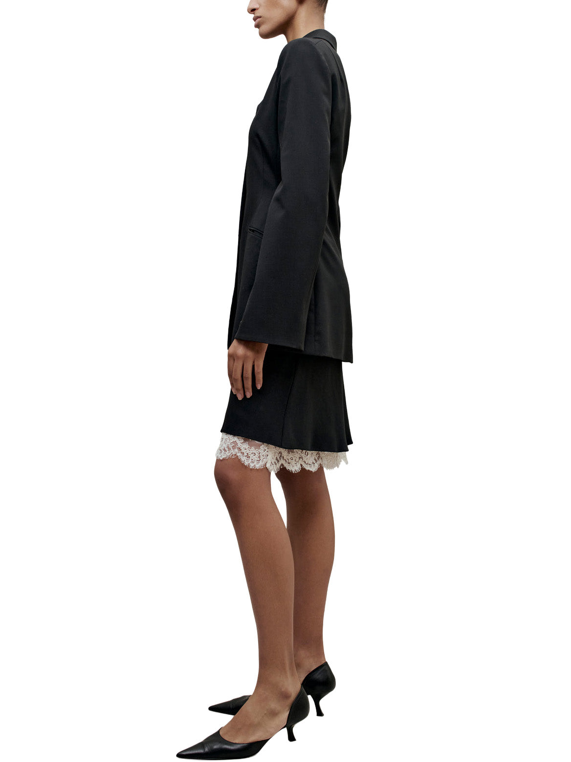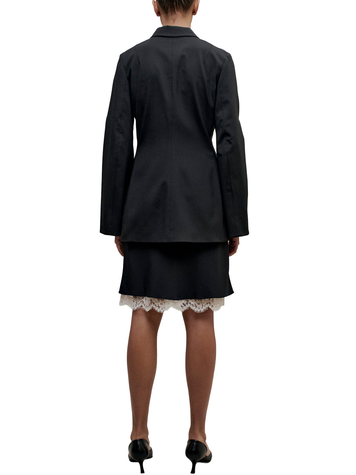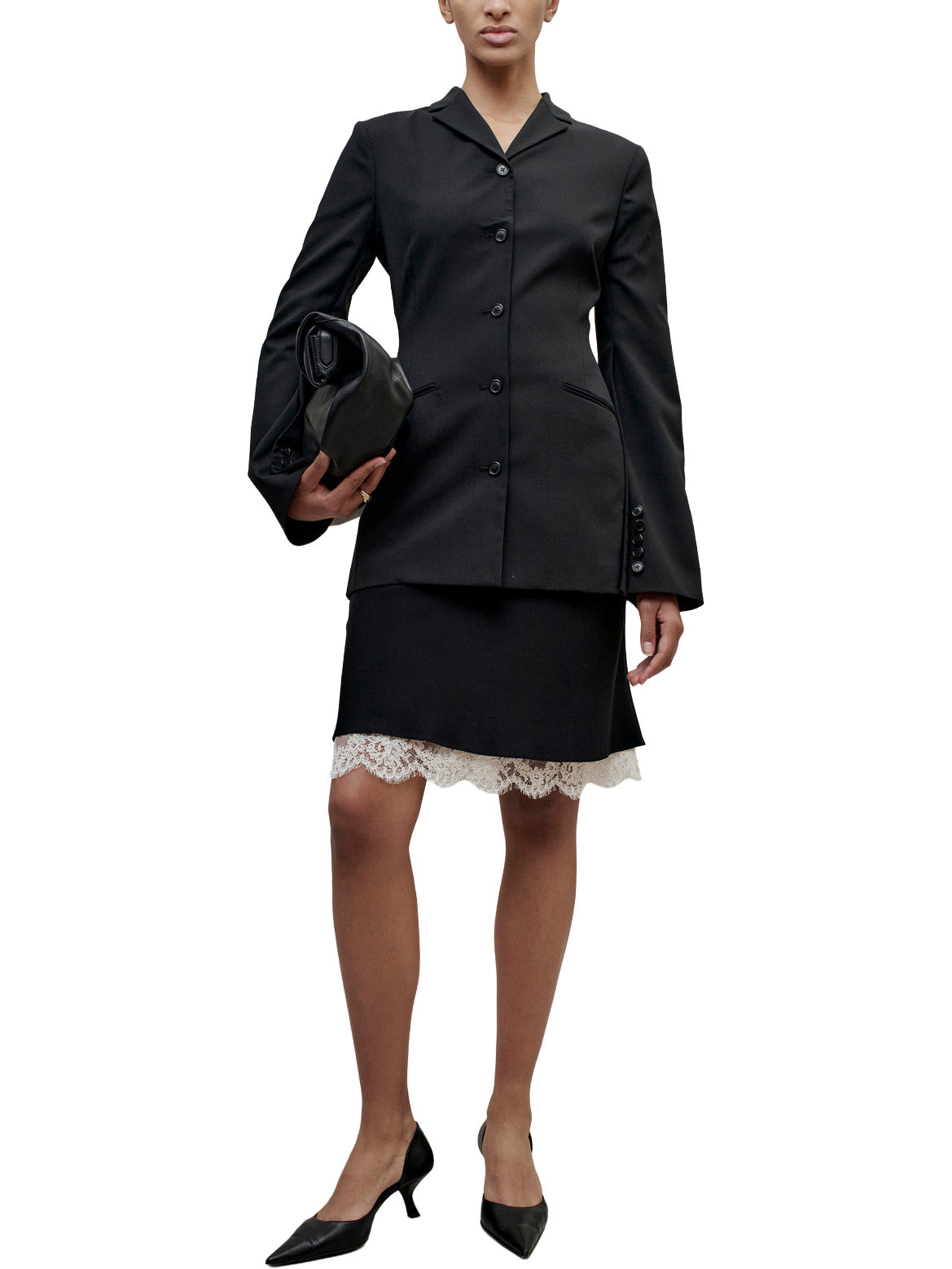 Longline blazer in black tropical wool. Notched lapel with five button front closure. Fitted through body with nipped waist and elongated silhouette. Welt pockets at hips. Long sleeves feature vertical vents with button details at cuffs. Structured tailoring with refined drape. Essential suiting piece that pairs with matching trousers or elevates casual separates.