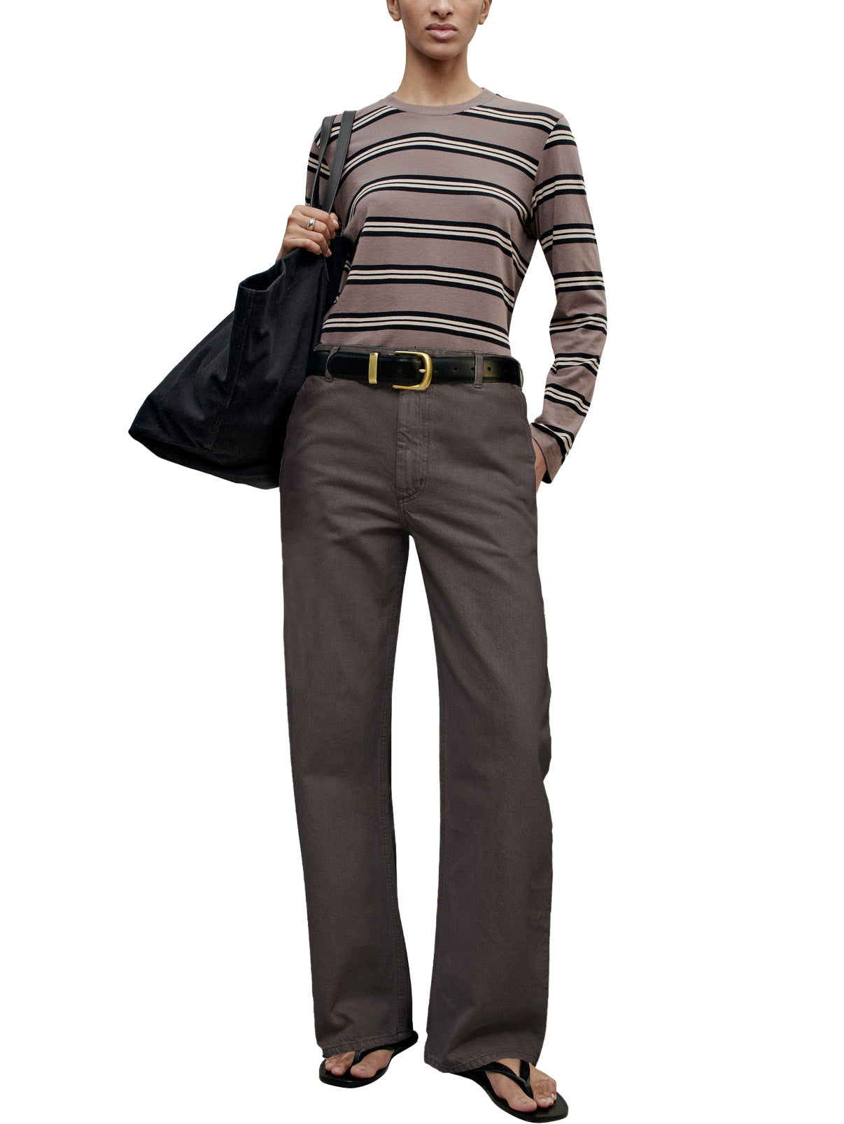 The Wide Leg Column Jean in new, perfectly washed Truffle cotton denim. Mid-high rise. Roomy through hip and thigh. Long, wide leg with subtle sculptural curve. 28” inseam. Deep side seam pockets and back pockets. Belt loops. True to size. Leather logo patch. Expect cotton to loosen after wear. Fits relaxed or true to size.