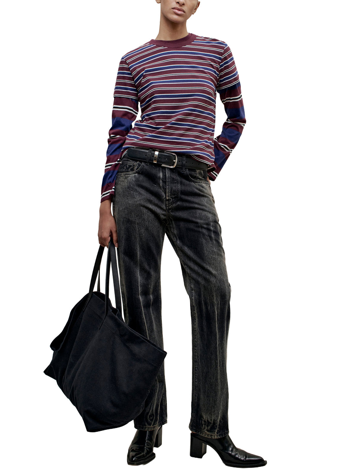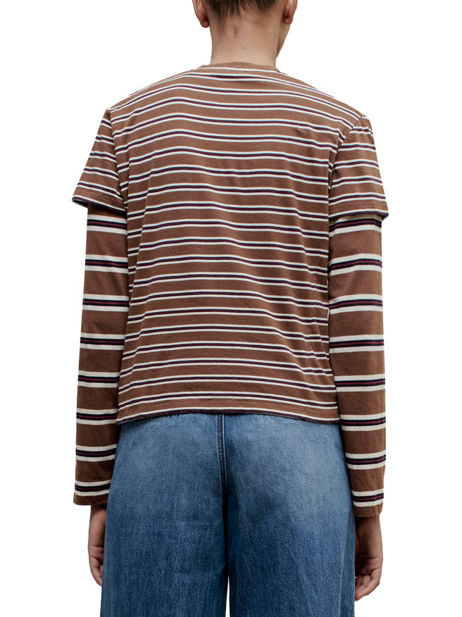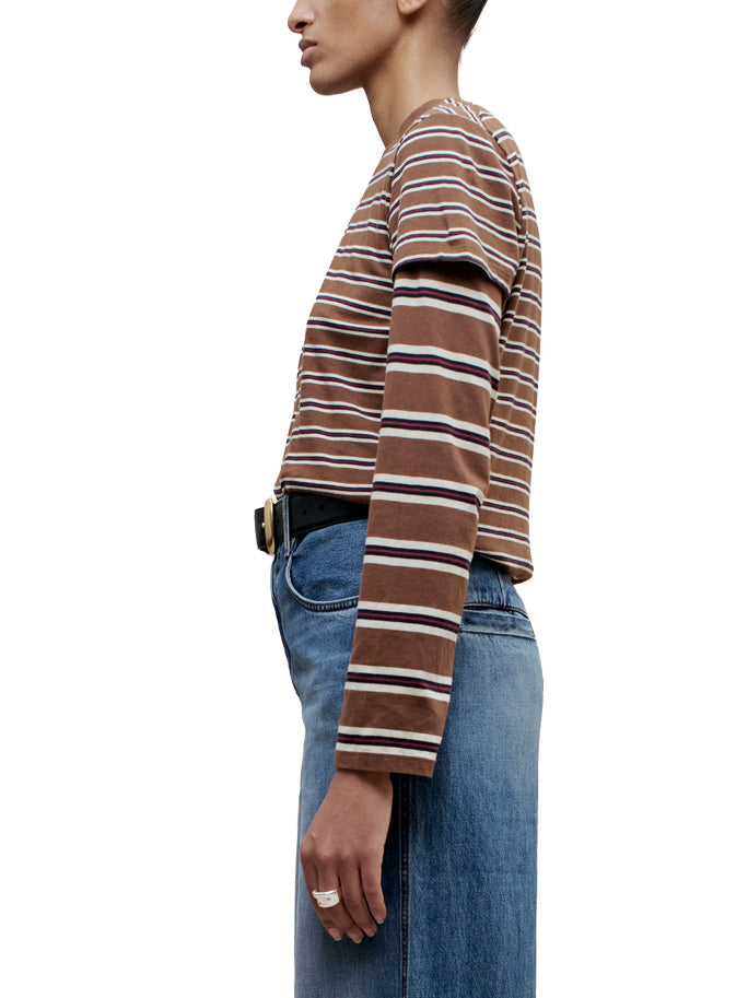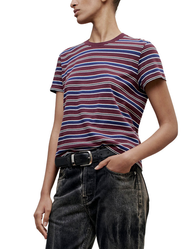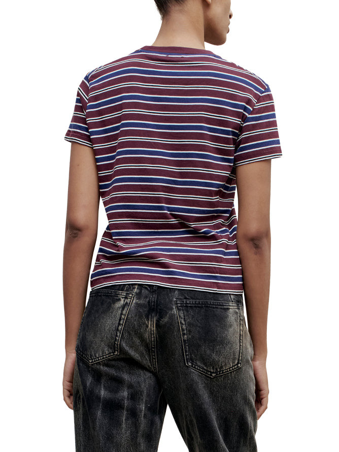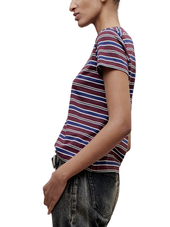 Best selling Kenzie t-shirt in new handmade custom stripe. The perfect short sleeve t-shirt with a relaxed boxy fit. Subtle cropped length. Roomy sleeves. Slight taper at waist. Unisex. Shifted side seams give tailored look. Solid knit binding at neckline. Designed to tuck perfectly into trousers or denim. Pair with contrasting striped Wynn Long Sleeve for a layered look.