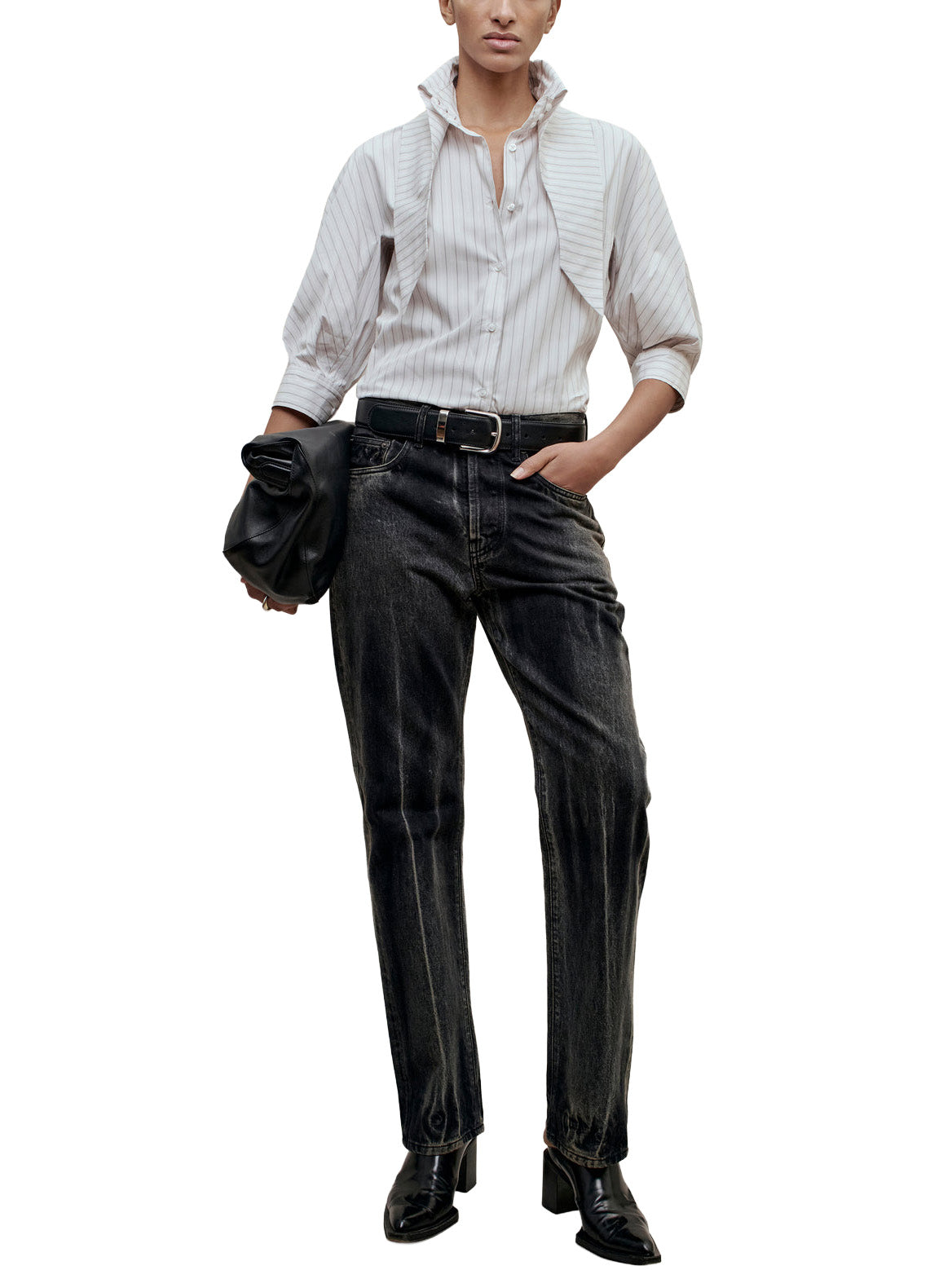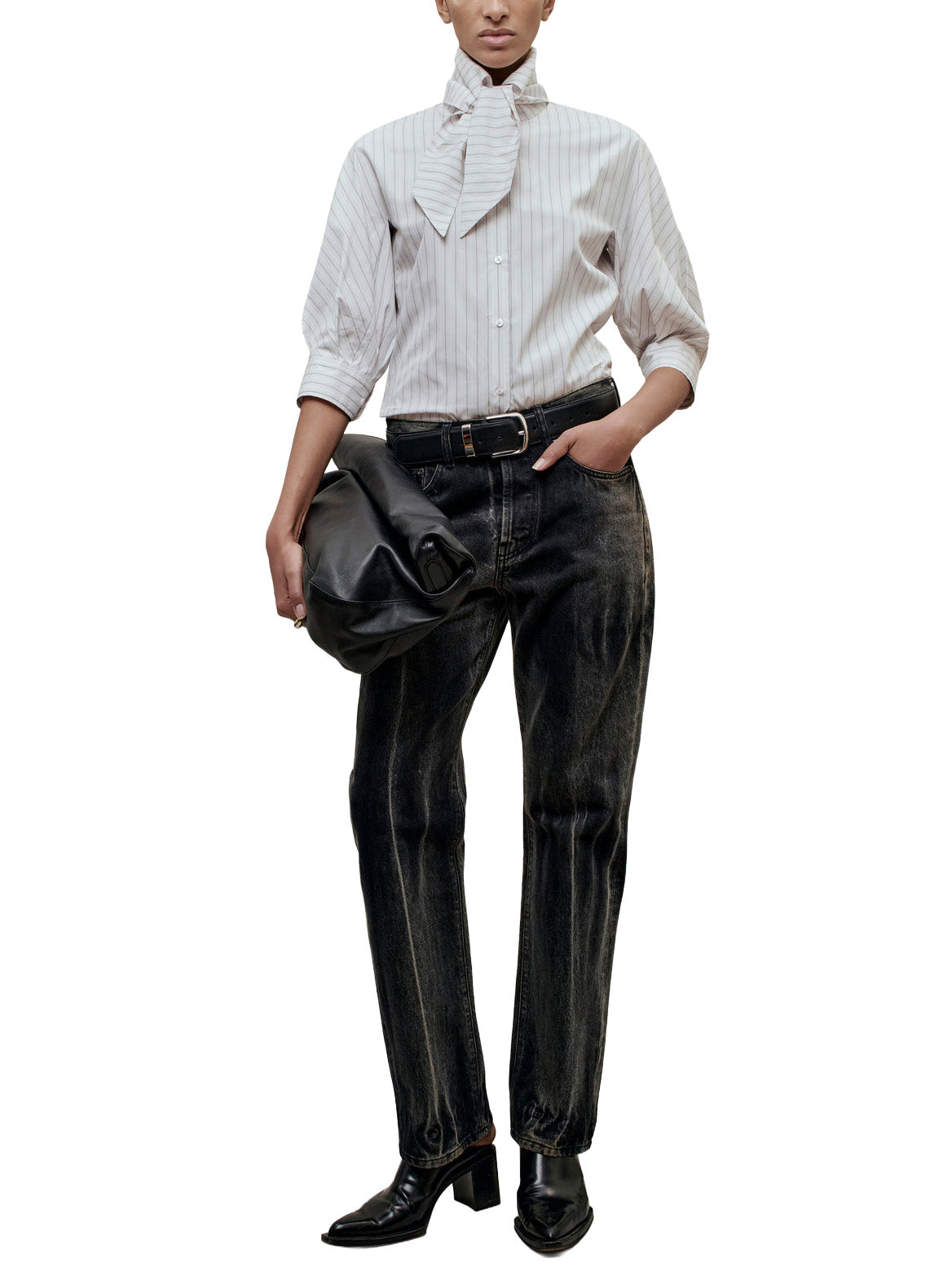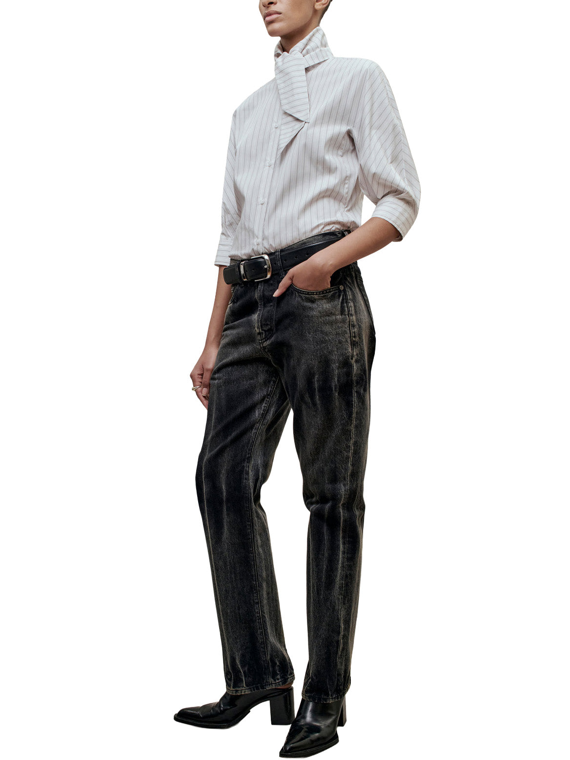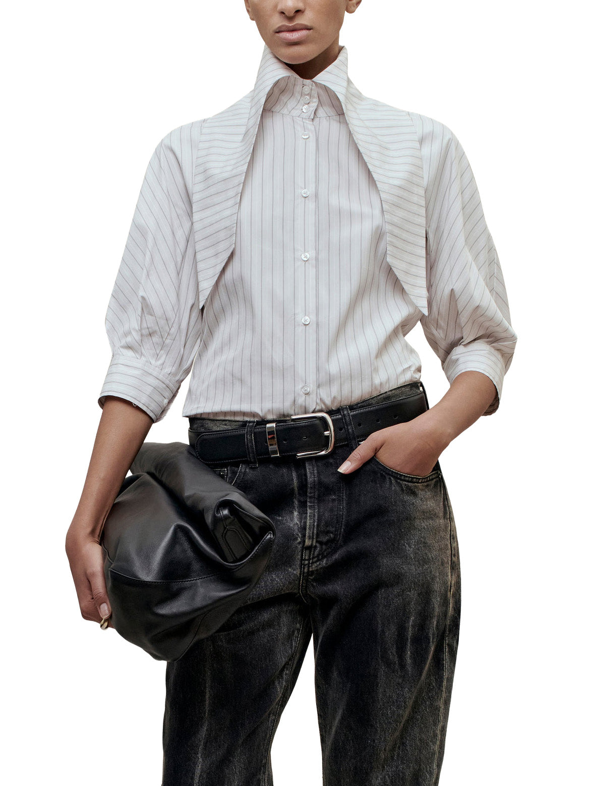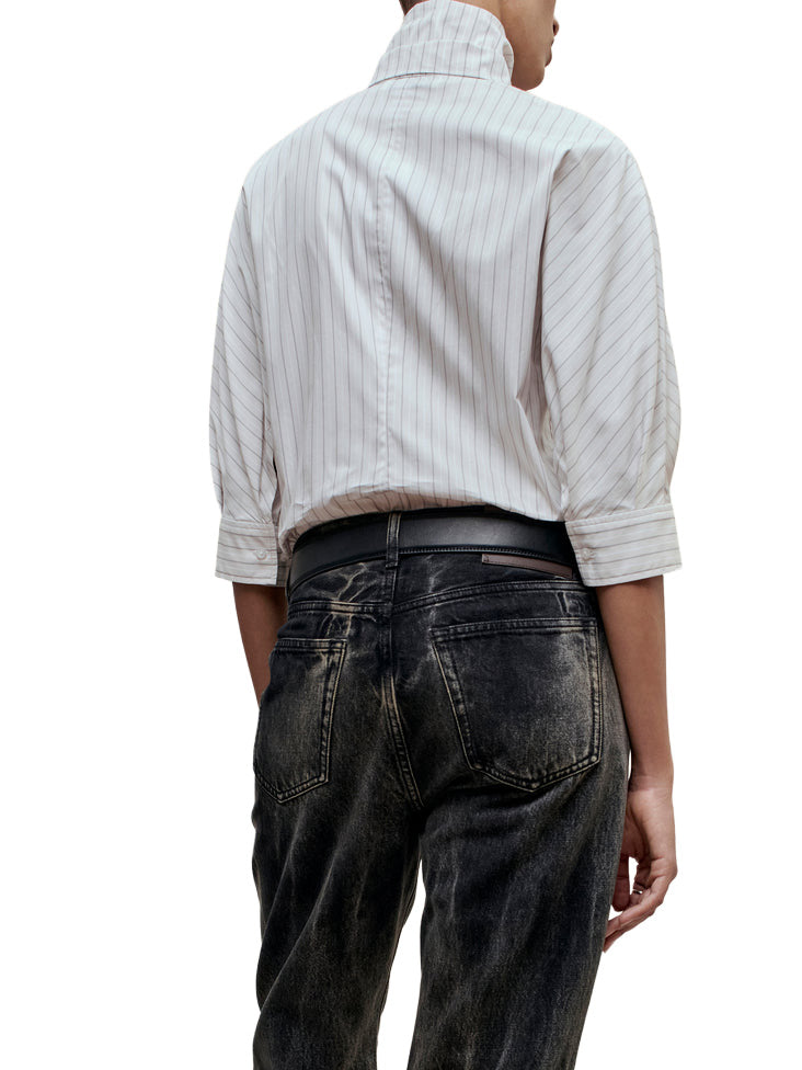 Classic button down with an exaggerated collar. Boxy, relaxed fit body with classic shirt detailing. Features 3/4 length sleeves that can be worn down or at the elbow as voluminous puff sleeves and button cuff. Tall collar stand into dramatized pointed collar. Style the collar fully buttoned up and tied under a sweater, or unbuttoned and untied under a suit.