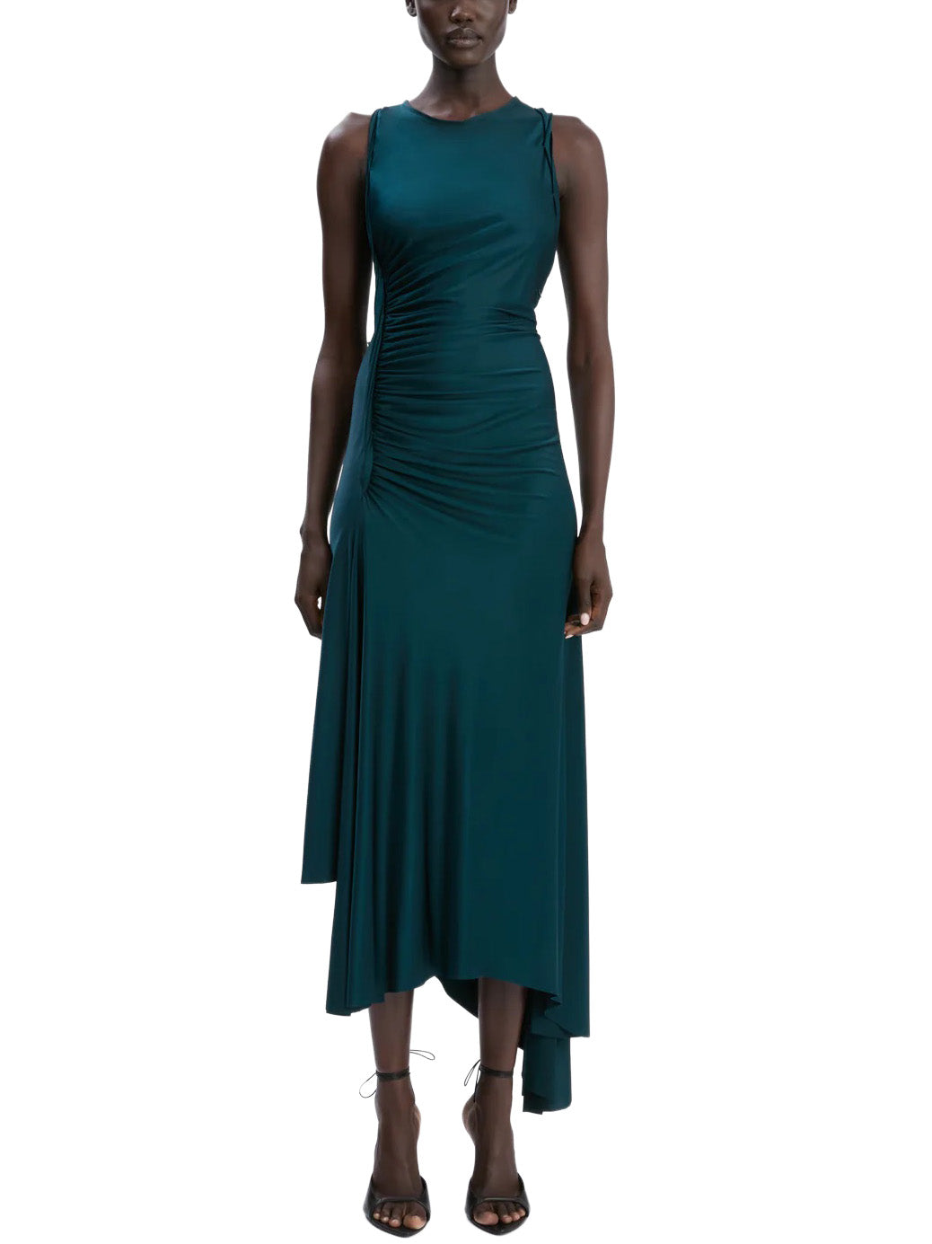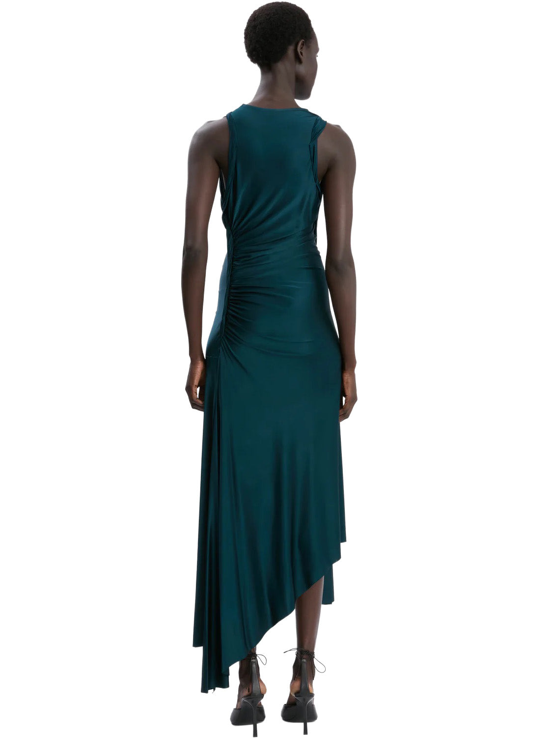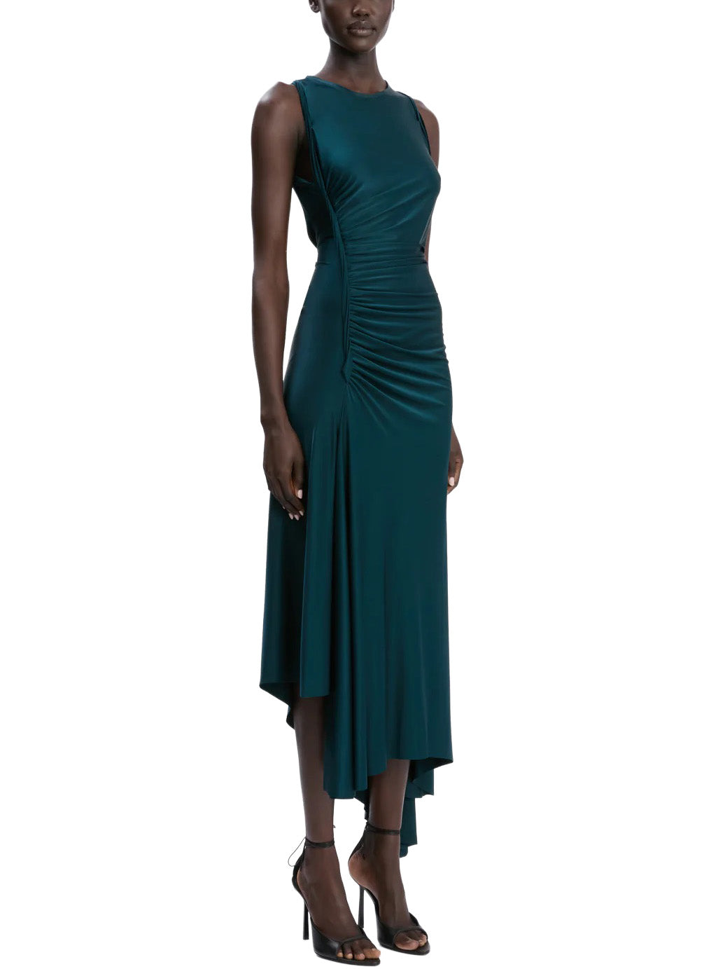Crafted from a high-shine stretch jersey and defined by tactile ruching across the bodice, the Twist Dress has a seductive charm. Presented in elegant Dark Teal, it has sensuous side seam splits, a directional asymmetric hemline and a twisted trim at the armholes.