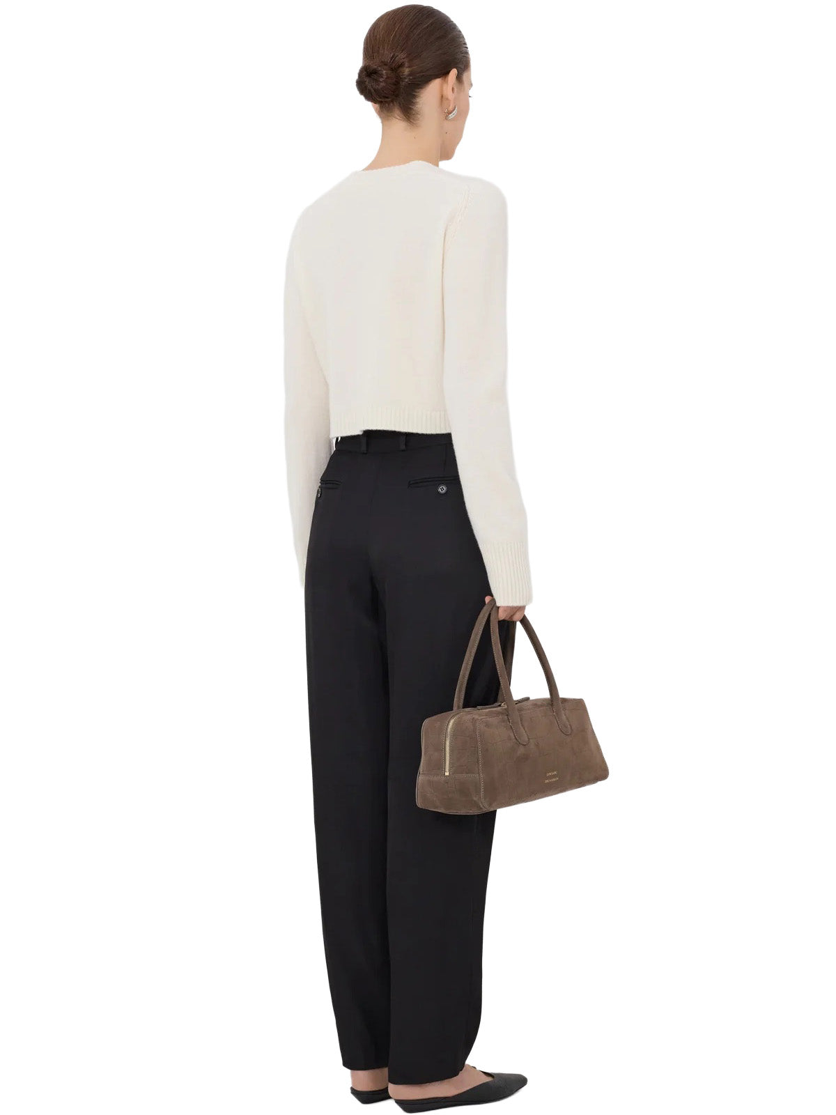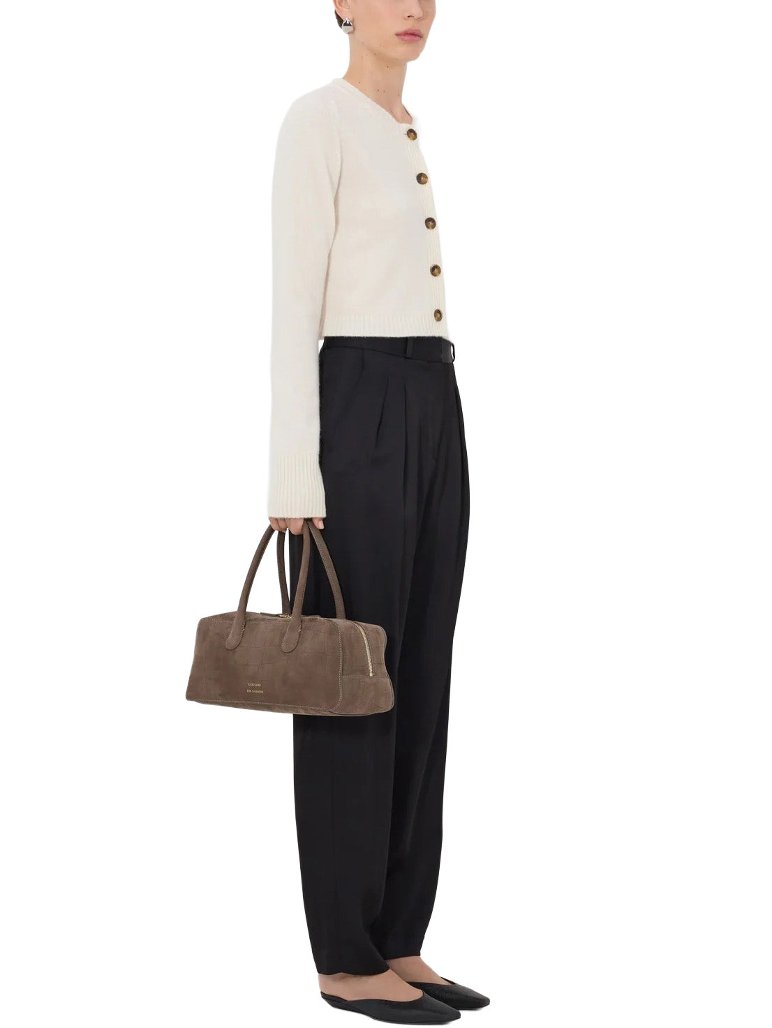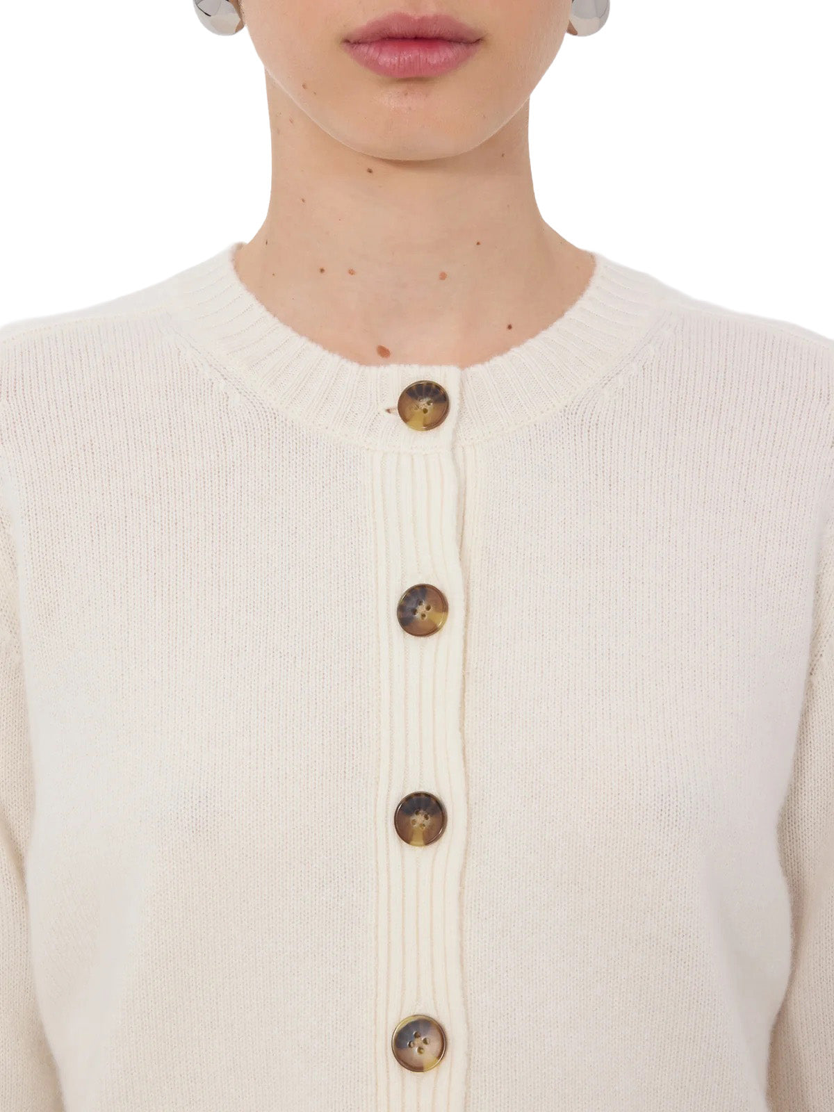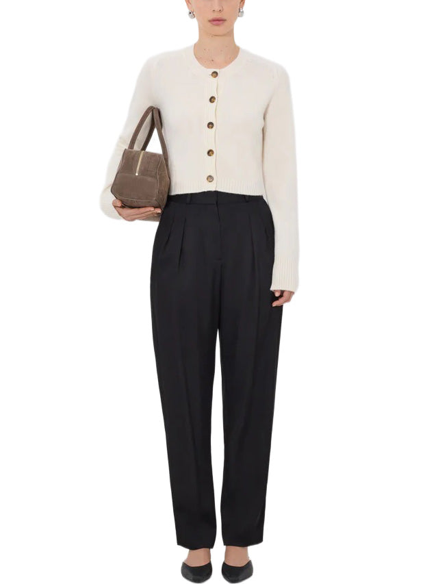 This cardigan is made of cashmere. Its cropped, fitted silhouette contrasts with long sleeves that create an slender silhouette. Details include ribbed cuffs and a five button front.