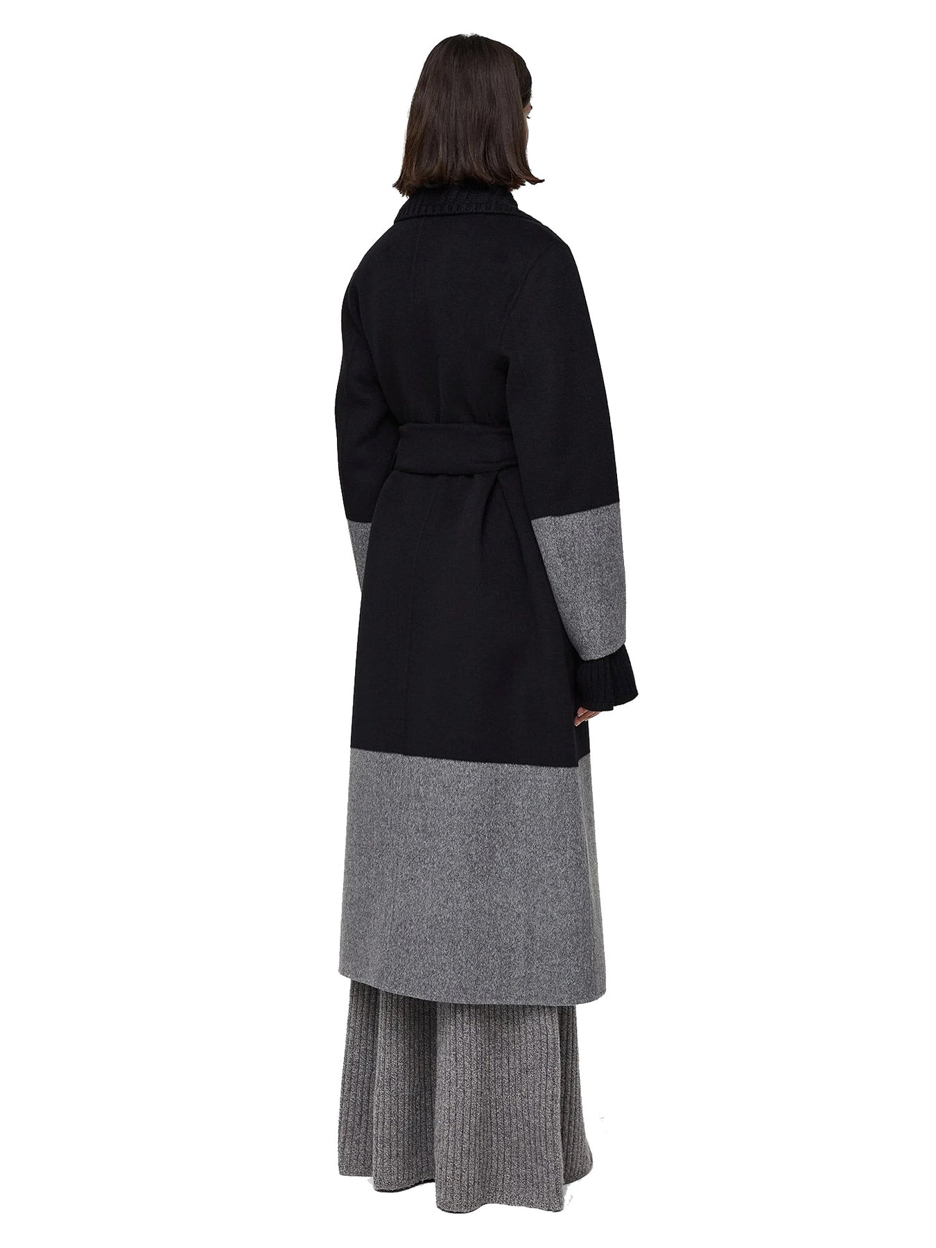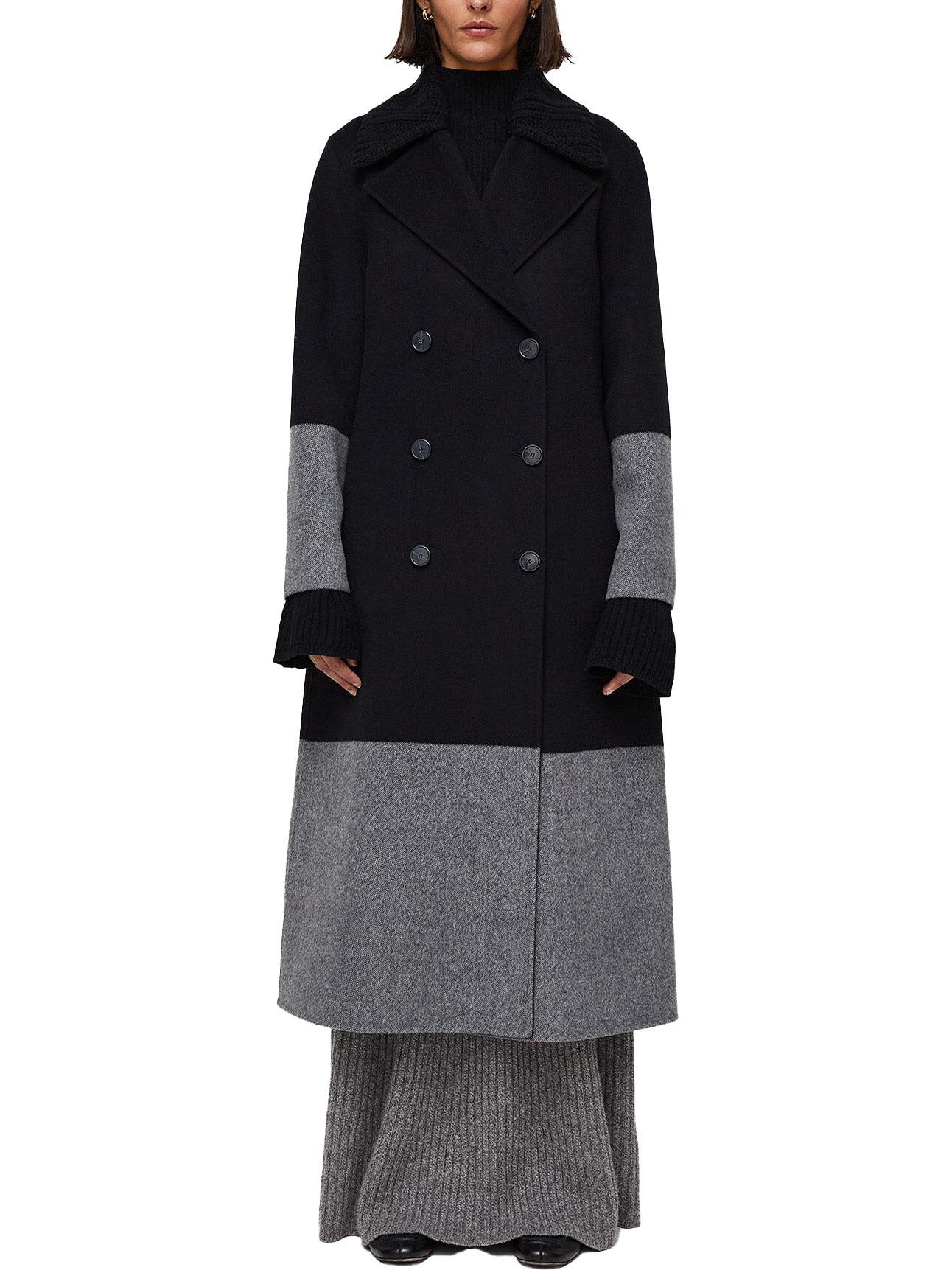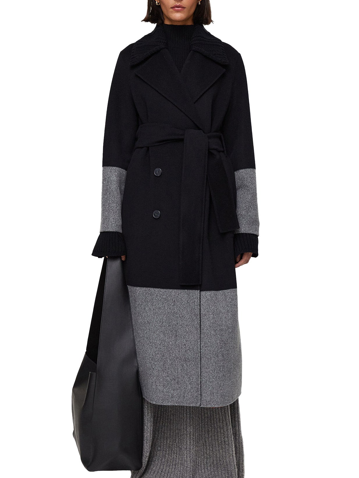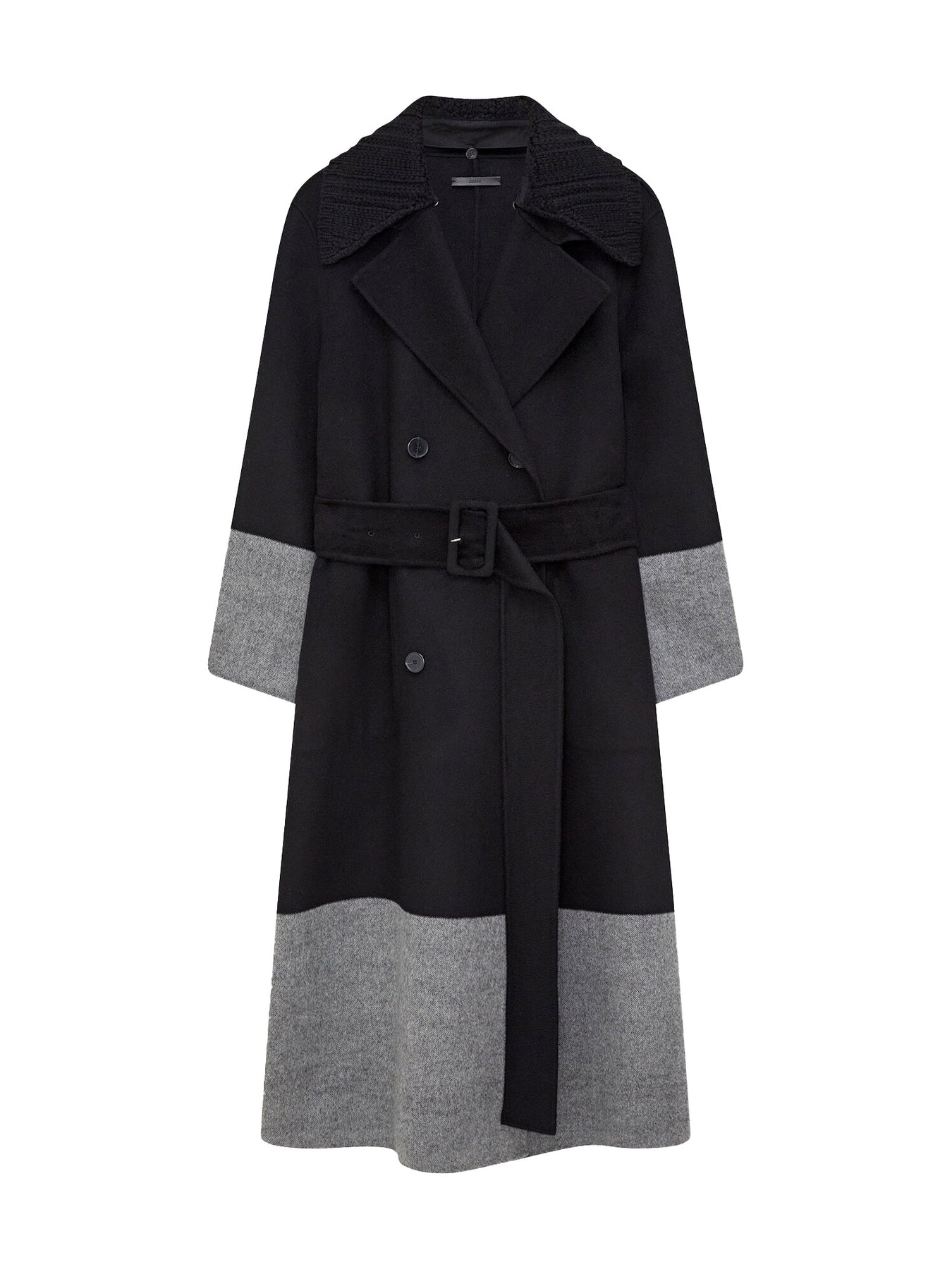 The Double Face Colour Block Merton Coat is a double-breasted, regular fit trench style, crafted from wool. This coat is reversible, featuring colour block grey panels on one side and plain black on the reverse side. This coat is finished with a detachable knitted collar.