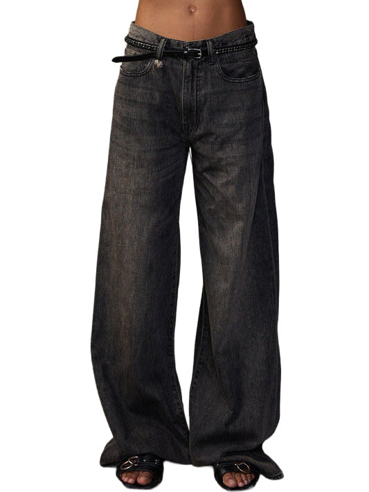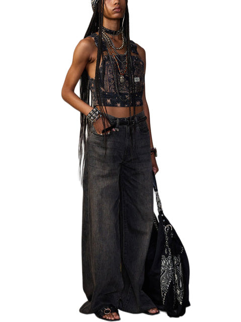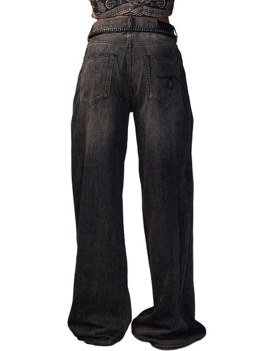 Relaxed five pocket wide leg jean with a flared leg built with Japanese mid black denim.