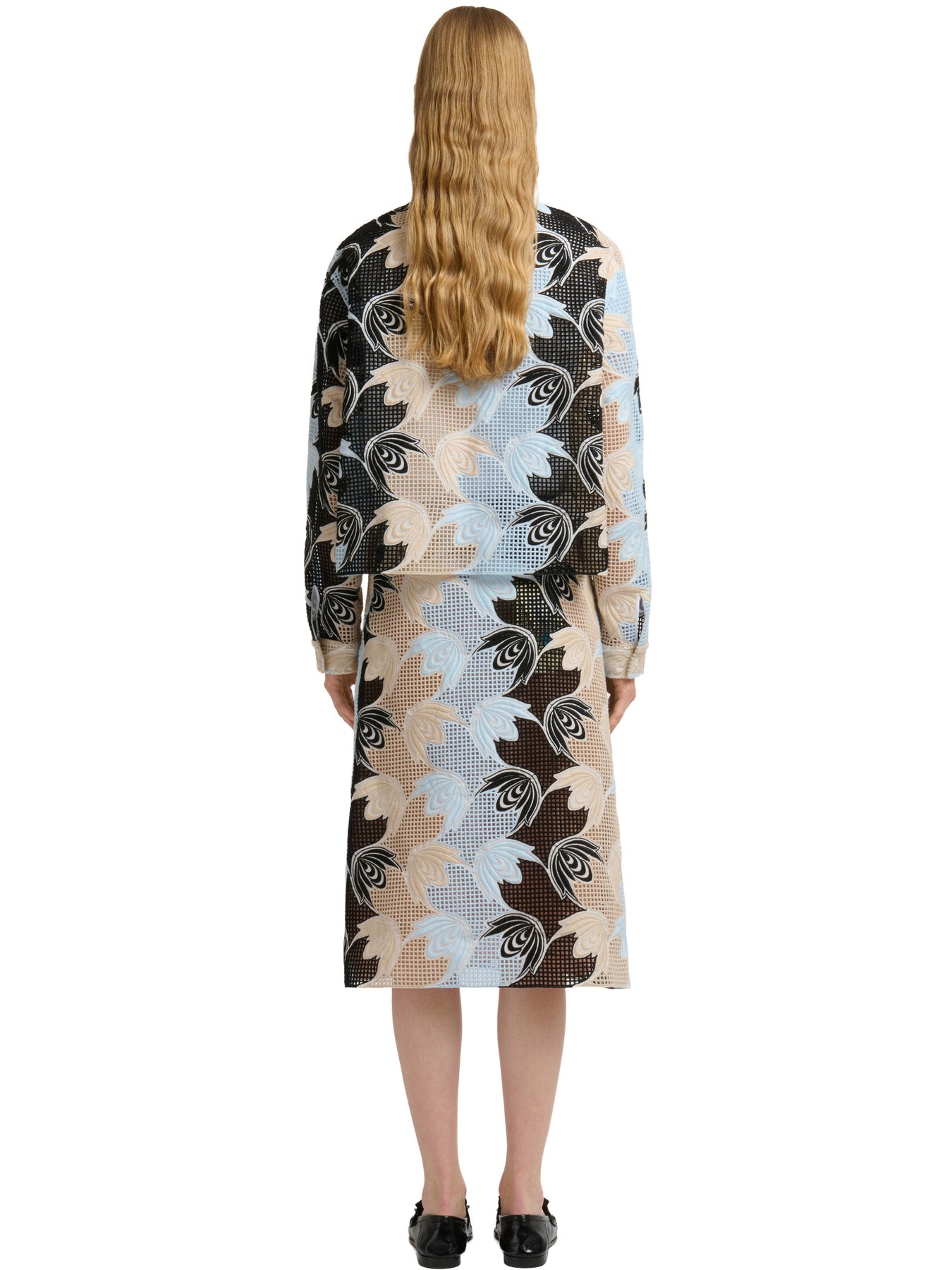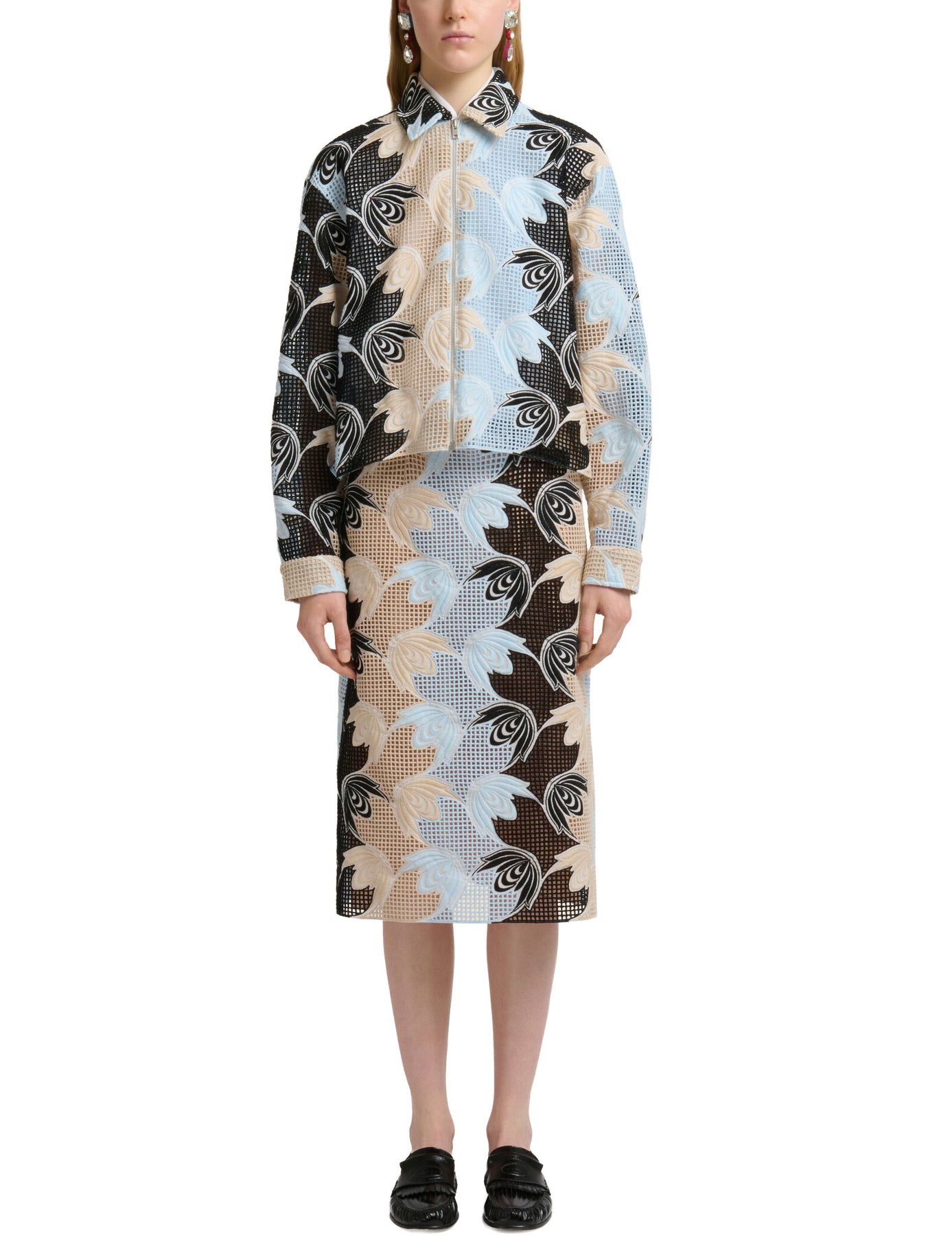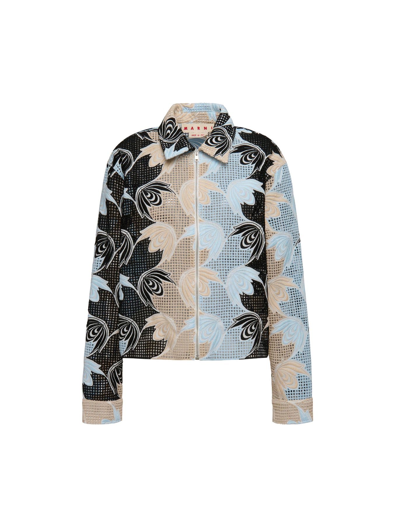 Long-sleeved embroidered shirt. Tricolour broderie anglaise mesh workmanship reminiscent of traditional tombolo lace, enriched with floral inserts. Collar and zip closure. Made in Italy