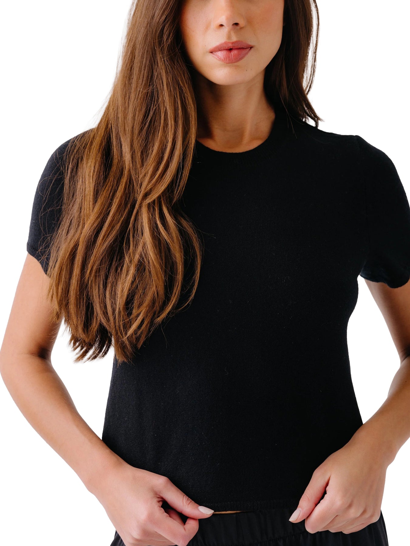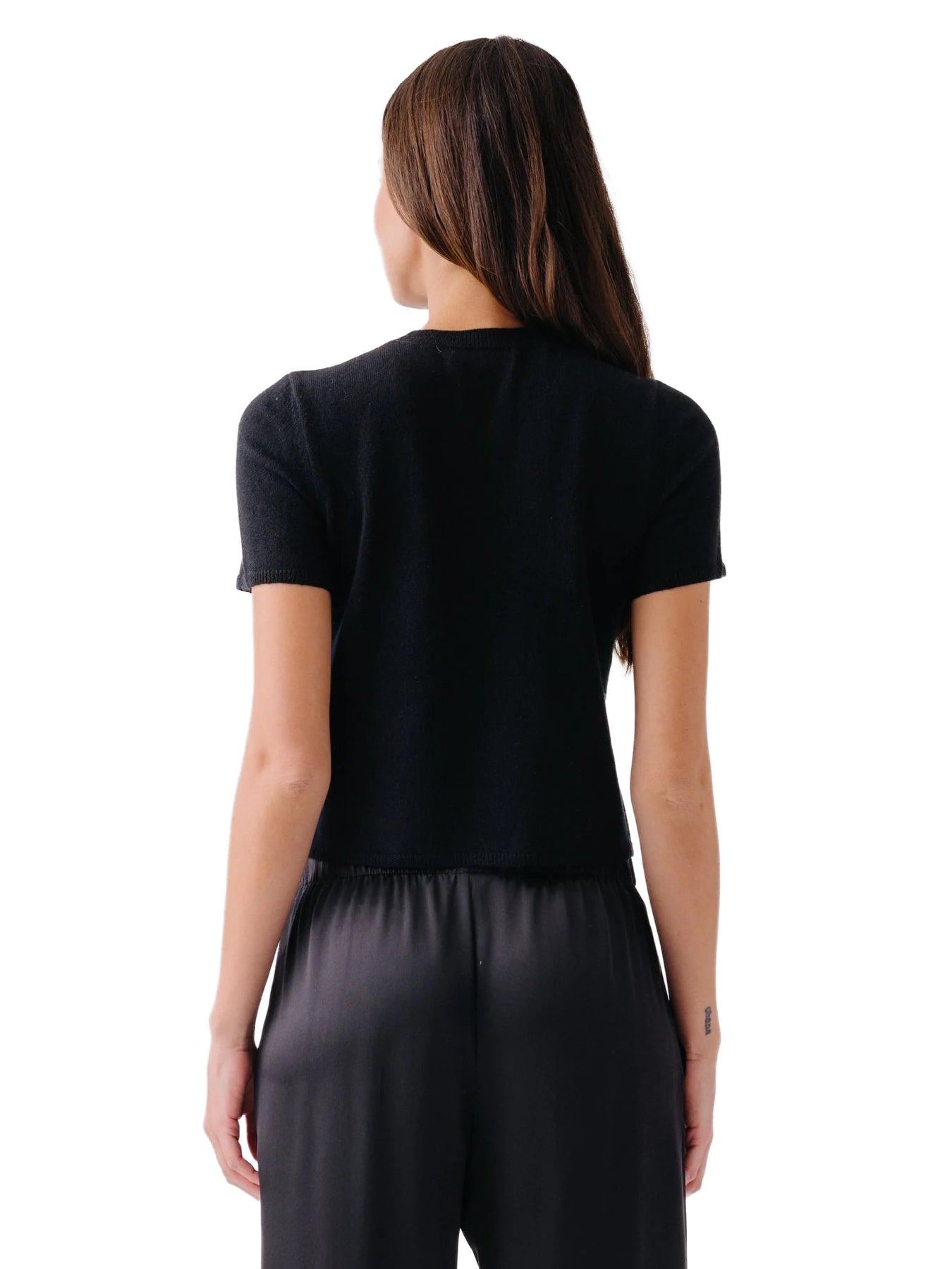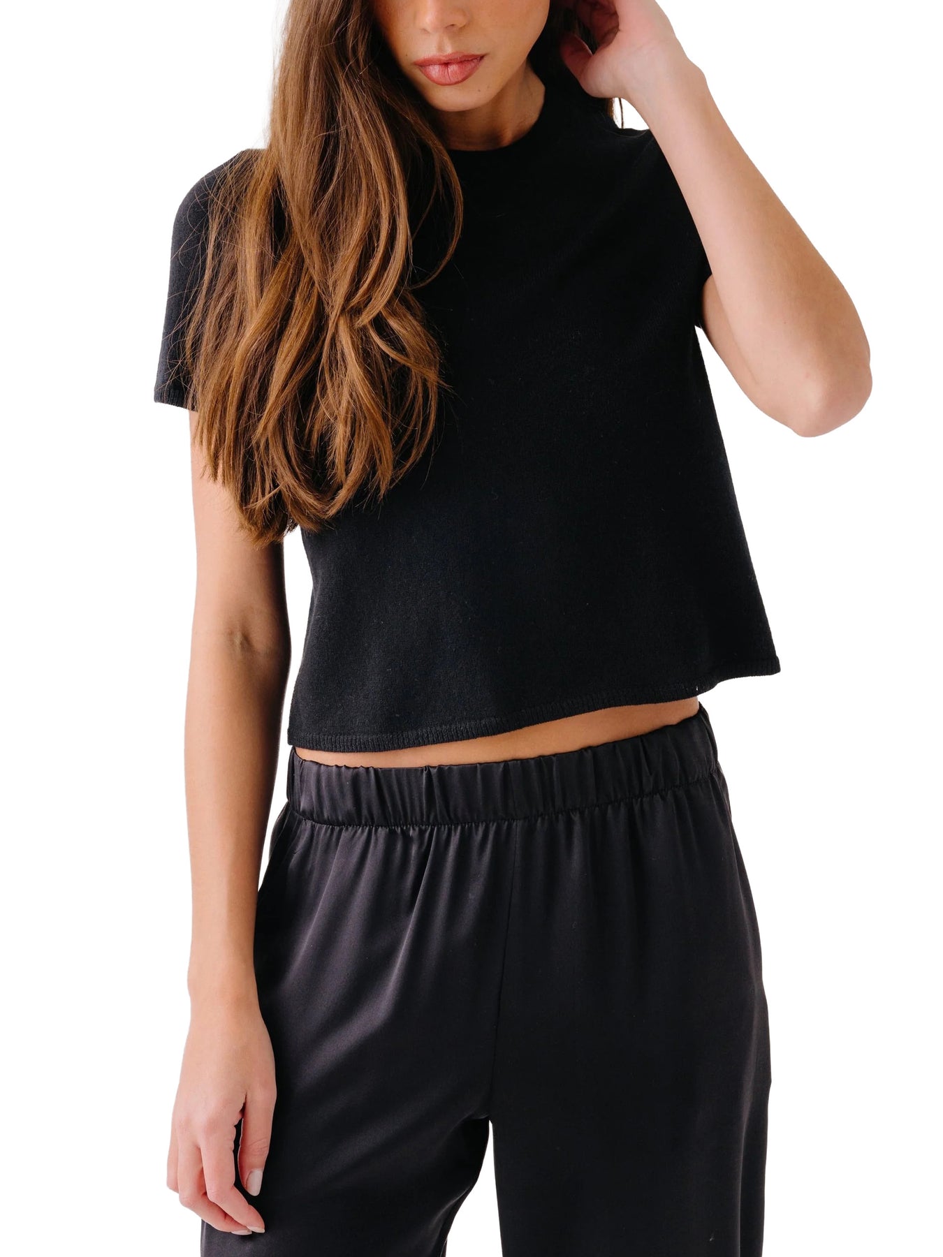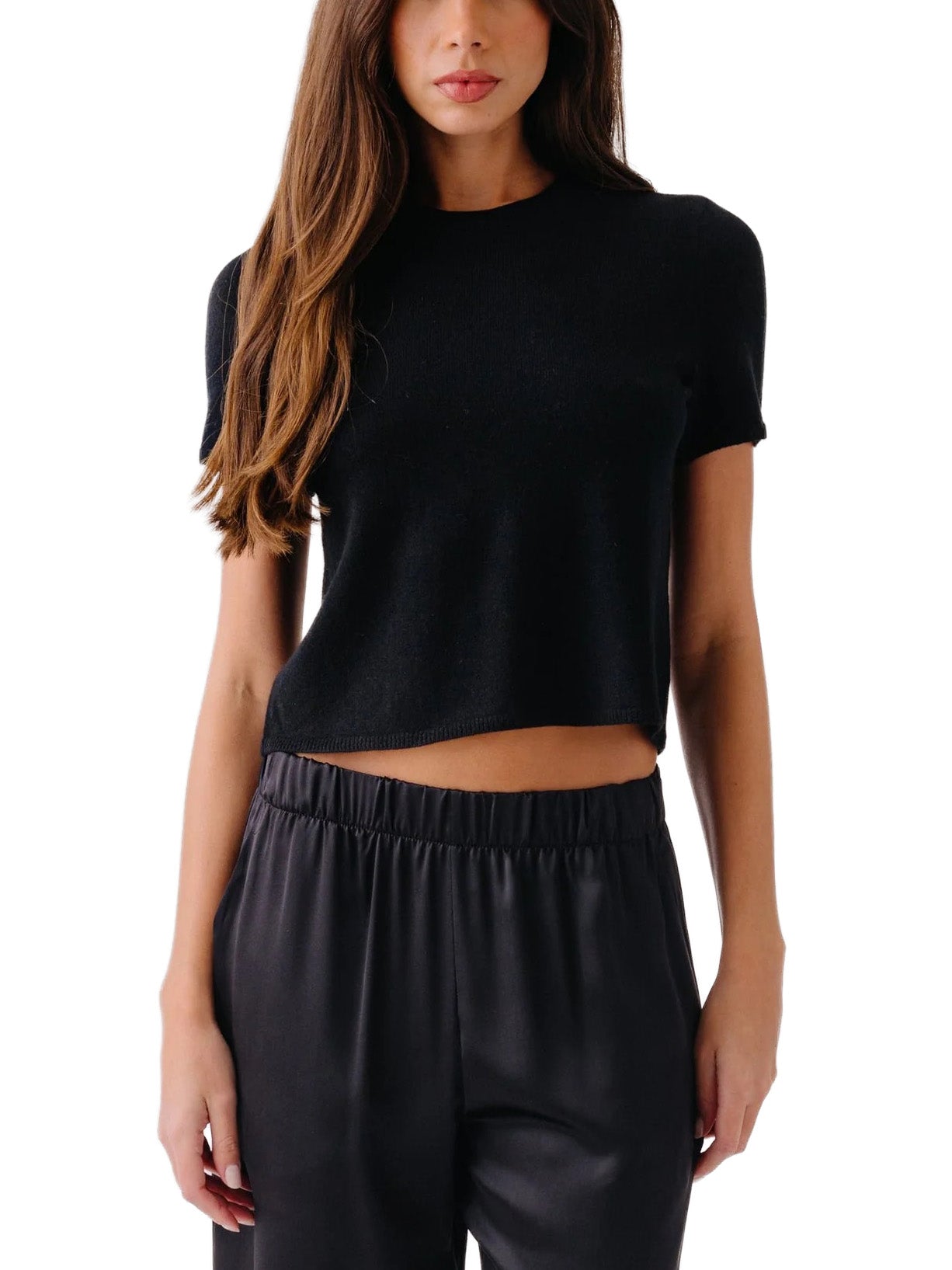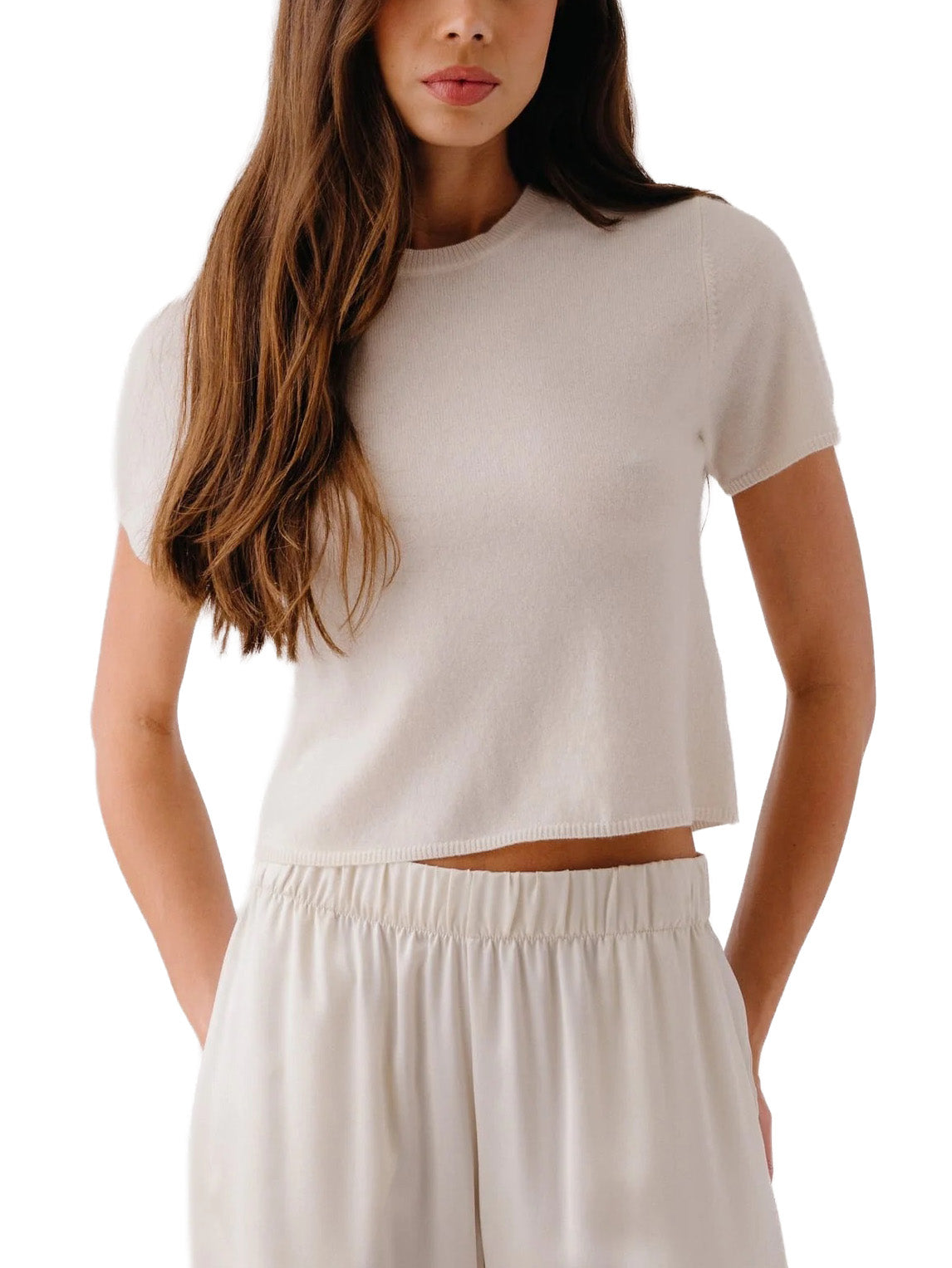 Short-sleeve cashmere crewneck with a relaxed, slightly cropped fit.