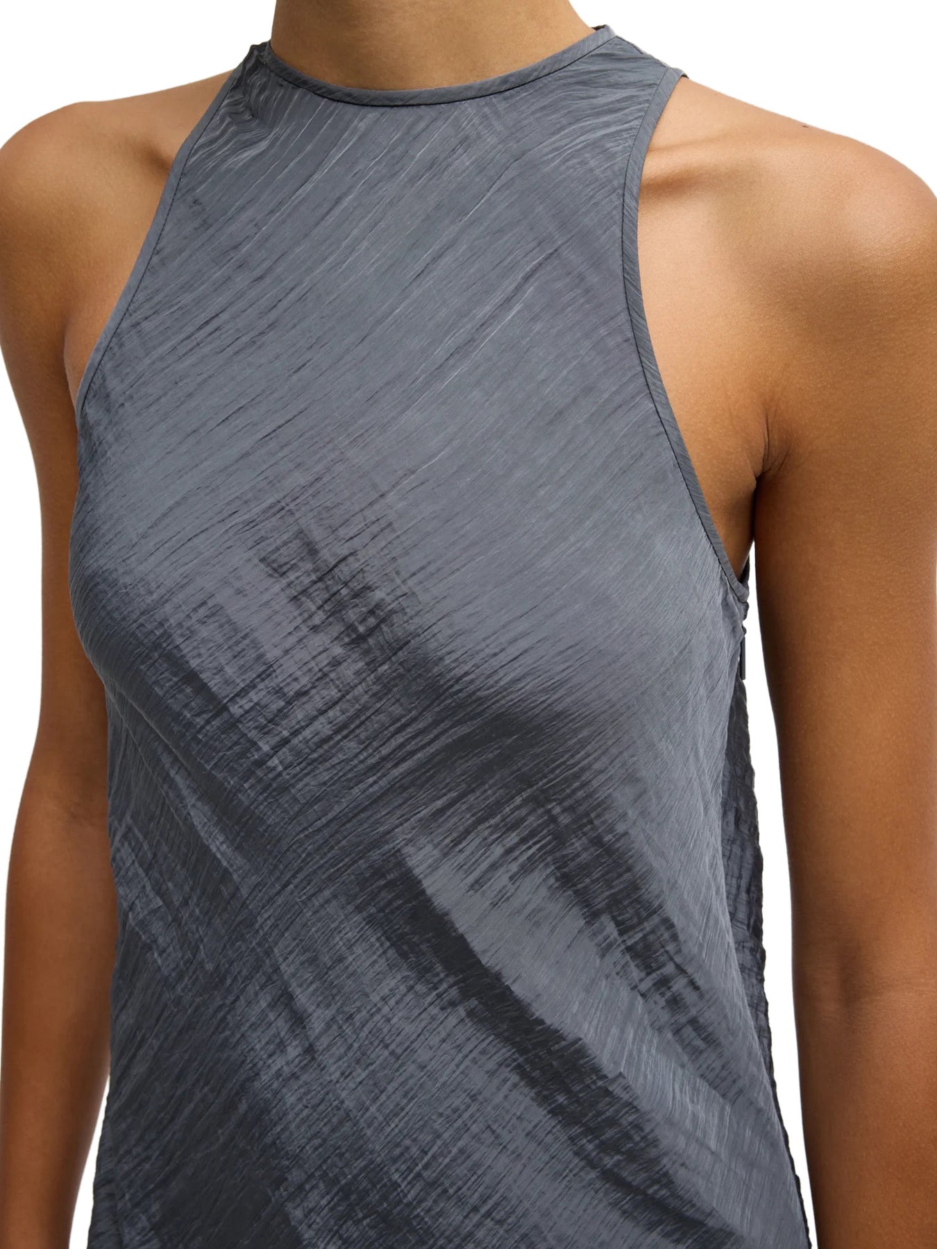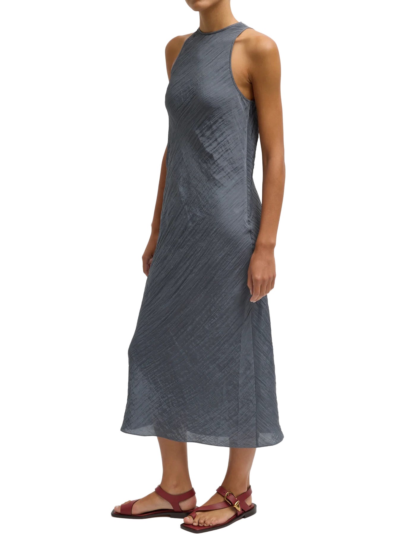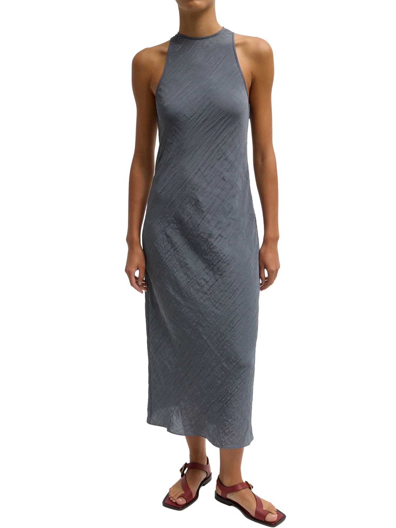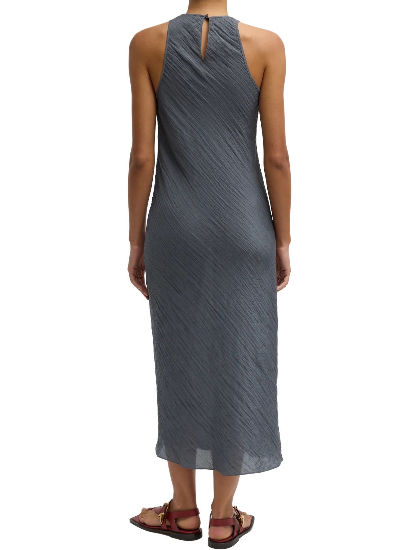 Bias-cut for fluid drape, the Crinkle Slip Midi Bias Dress is crafted from a lightweight textured fabric with a naturally marbleized finish that adds subtle depth without feeling precious. The smooth neckline and slip silhouette create effortless movement, making it easy to dress up or down. Pair it with flats or sneakers for daytime PDW moments, or elevate it with heels and tailored layers for evening while keeping the core look intact.