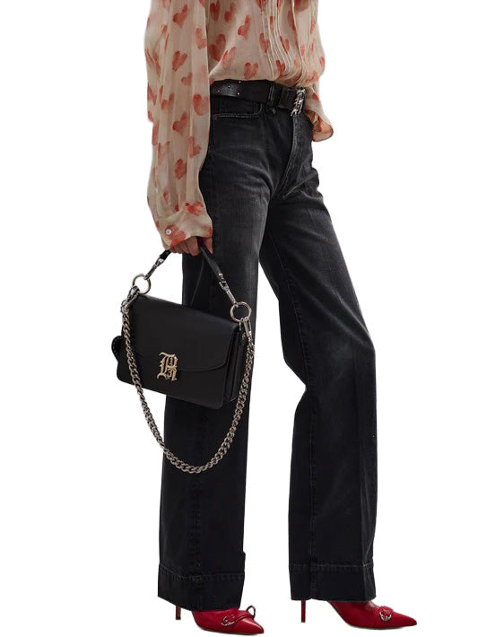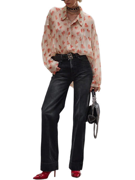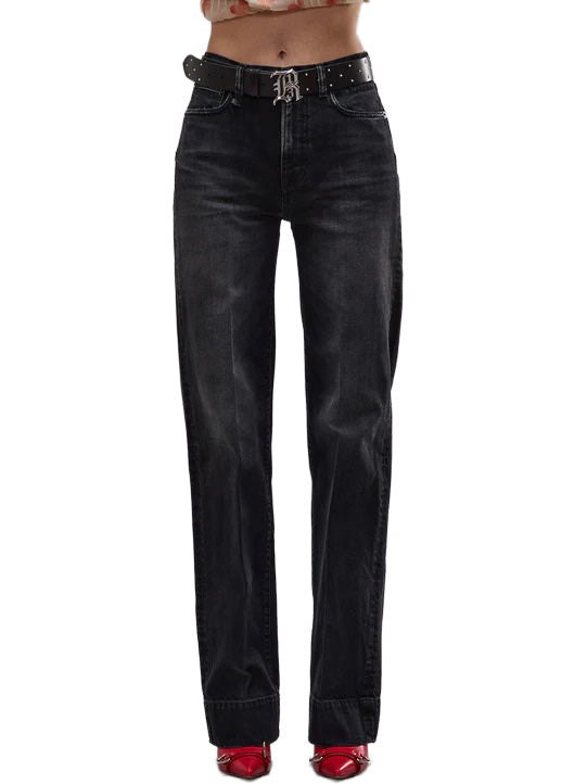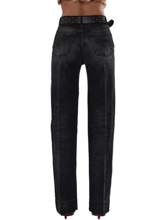 High rise straight leg jean featuring a crease at the center built with rigid 12.5 oz black denim and featuring a mid-heavy worn dark black wash with mild grinding throughout local areas.