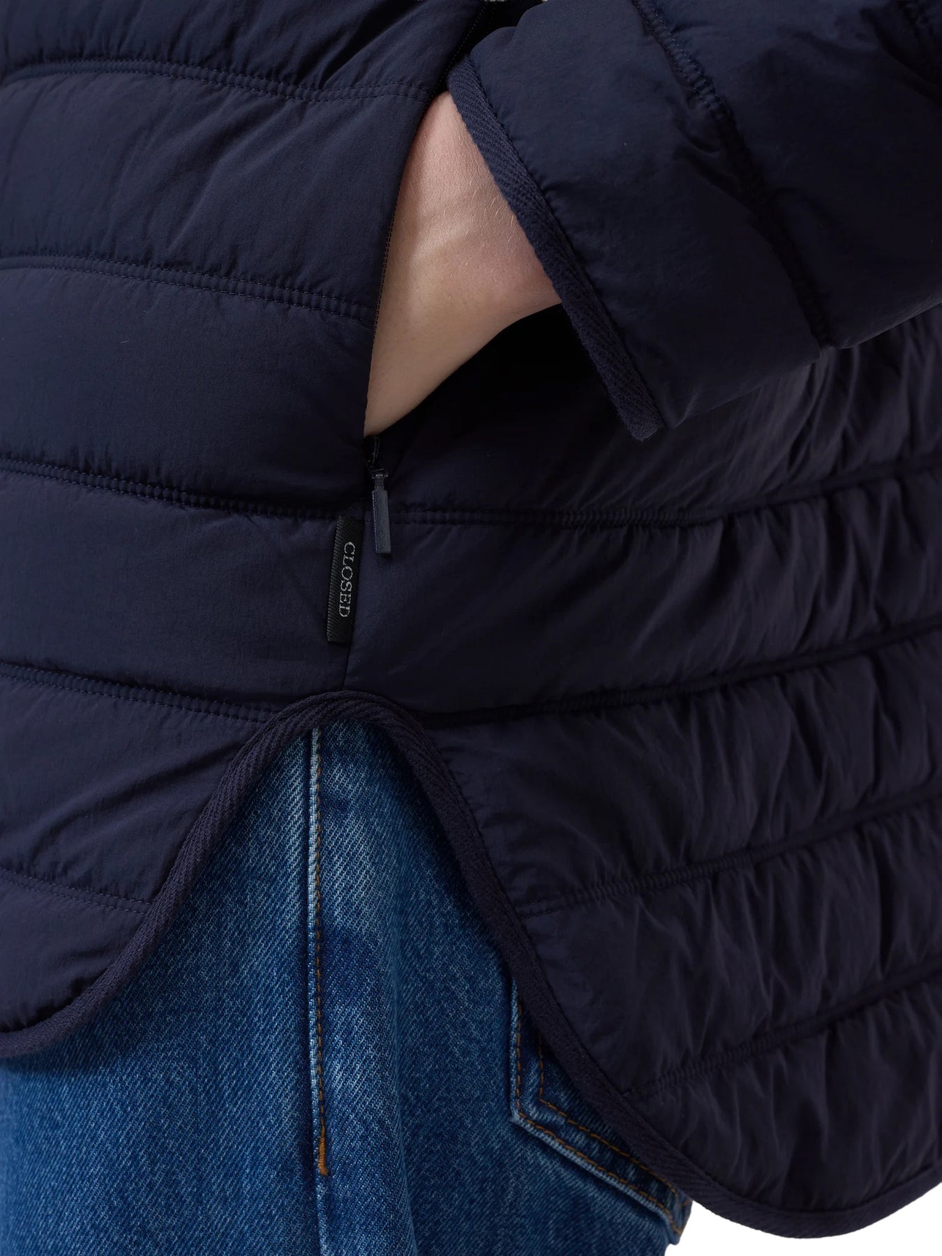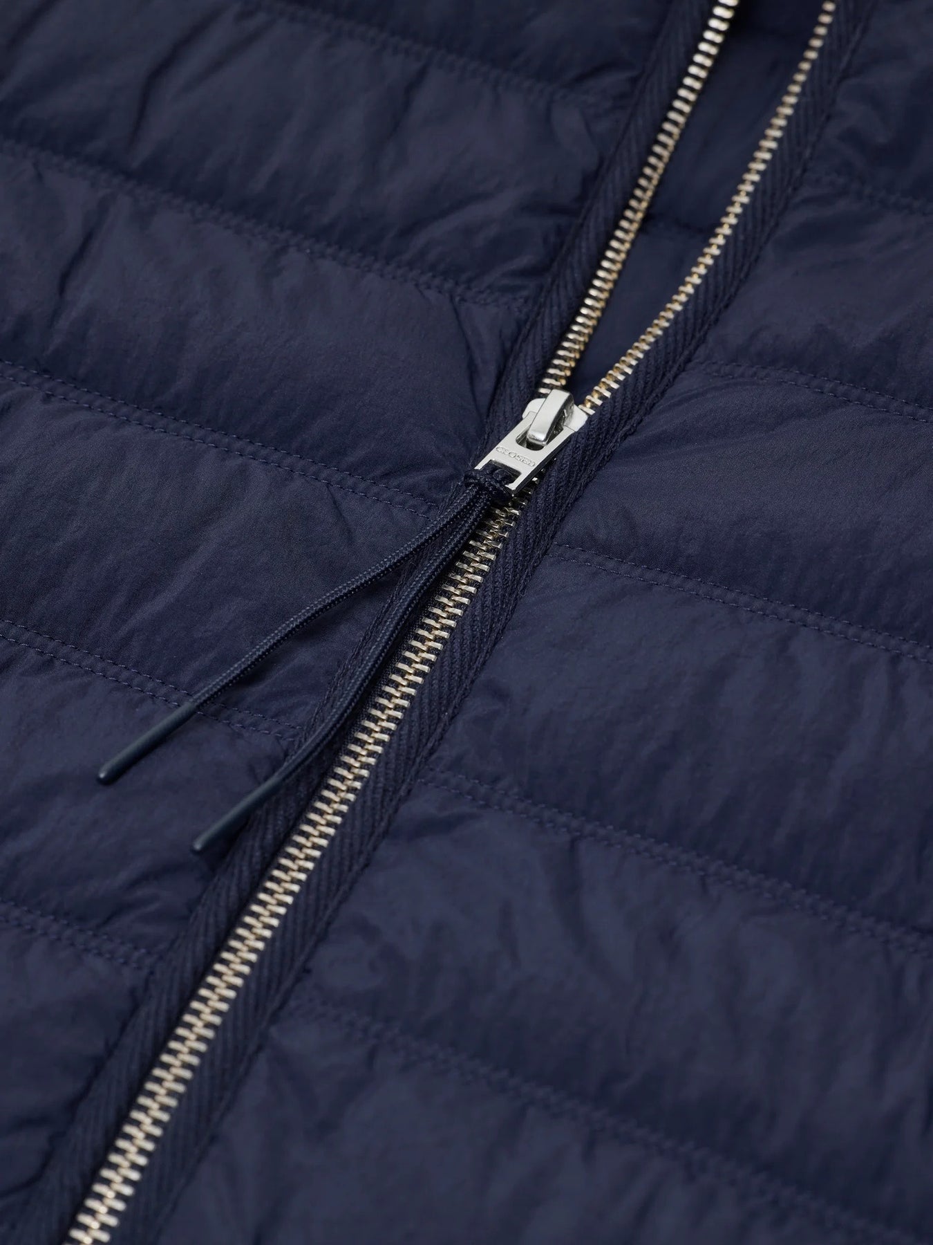 The quilted zip jacket showcases a regular length with a slim silhouette. Crafted from water-repellent recycled nylon, it features a light crinkle texture and matte finish with an incredibly lightweight feel. Twin-needle quilting details reference workwear heritage, while zipped side pockets and a shaped hem with drop provide functional elements. The eco-conscious design includes Thermore's lightweight ecodown fiber padding as a sustainable down alternative.
