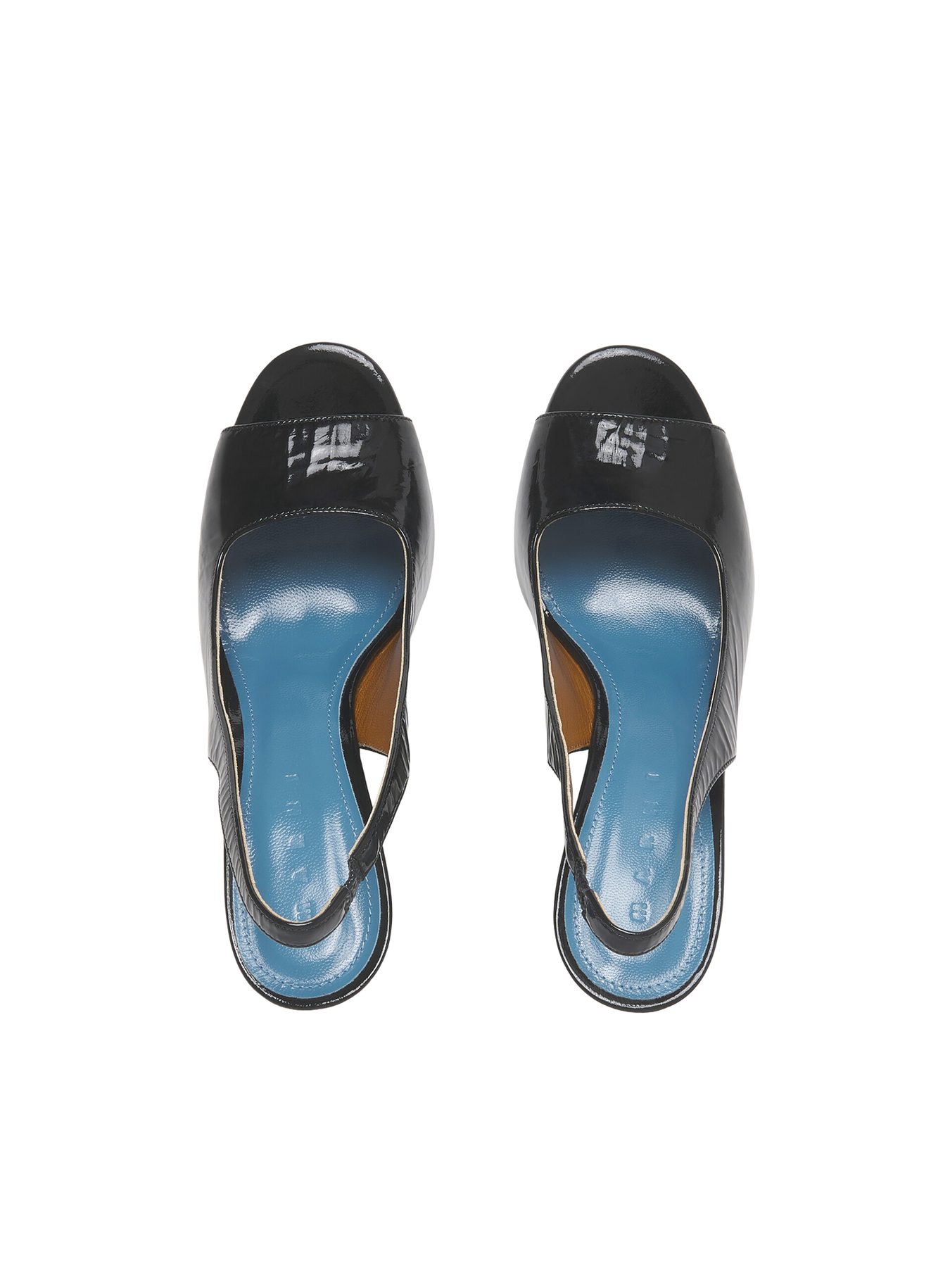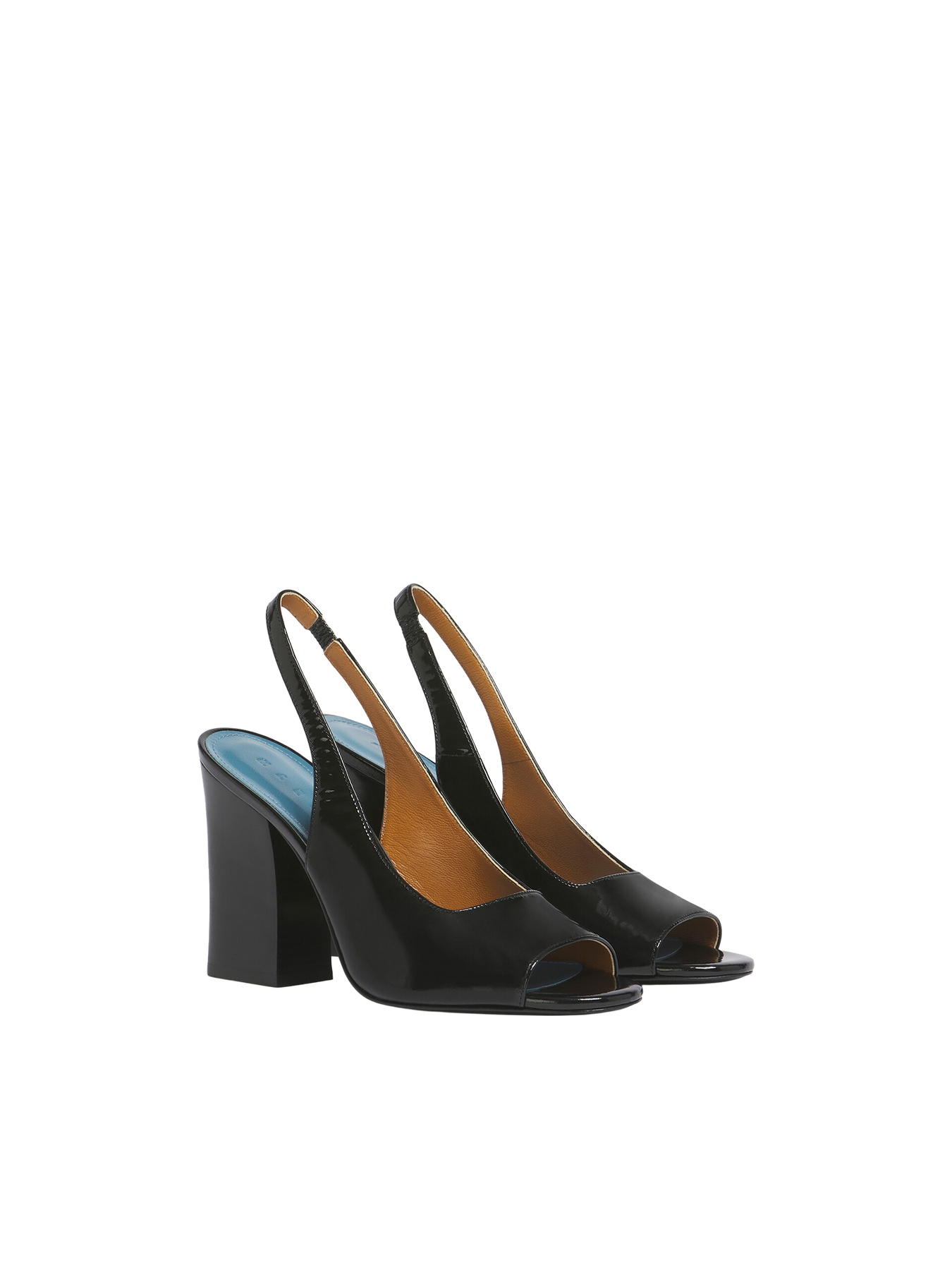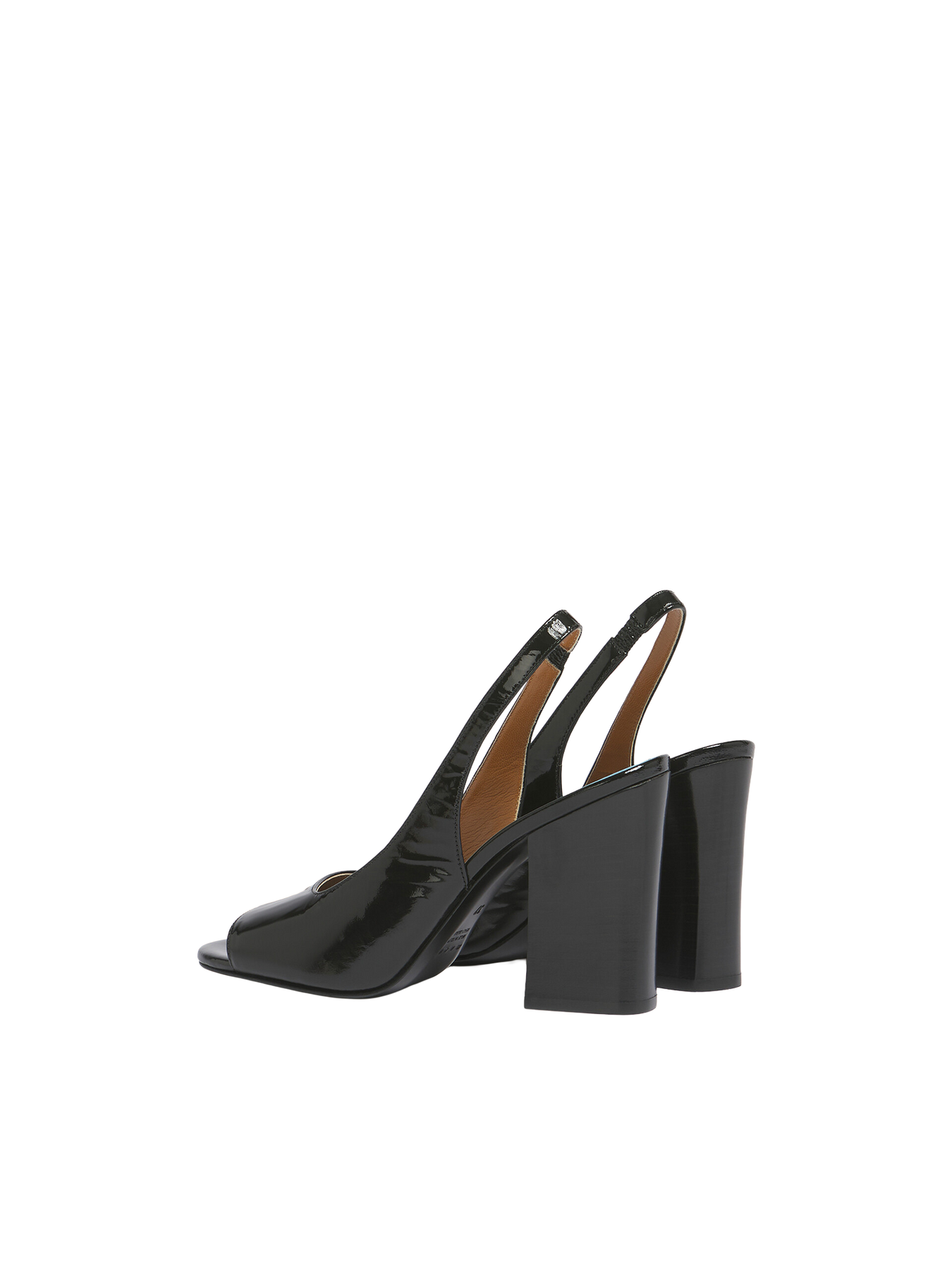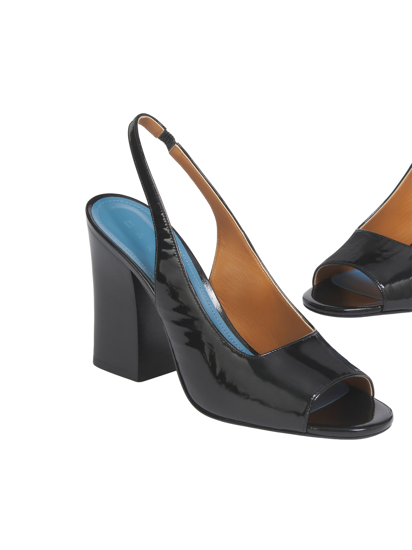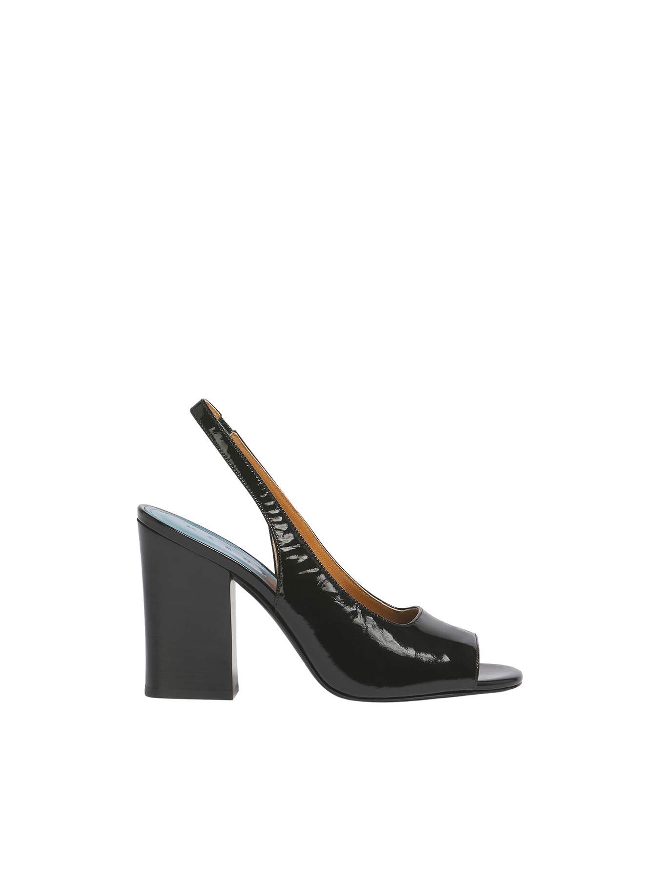 Open-toe sandal made from soft naplak-effect patent leather. Elasticated slingback strap and high block heel. Soft kidskin lining and contrast insole. Made in Italy