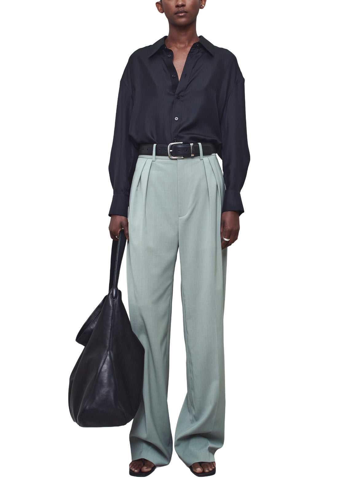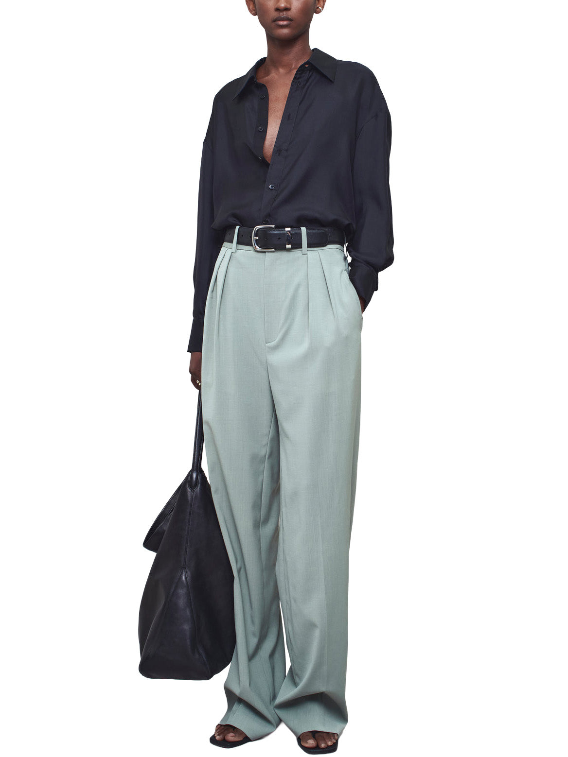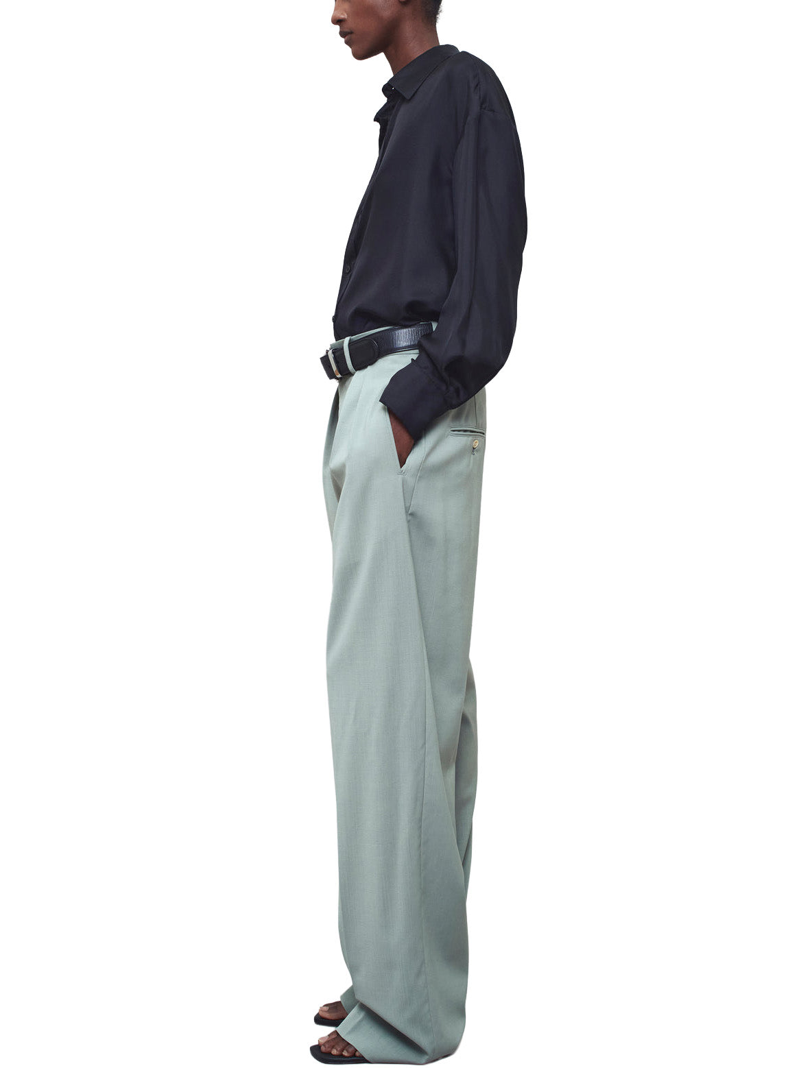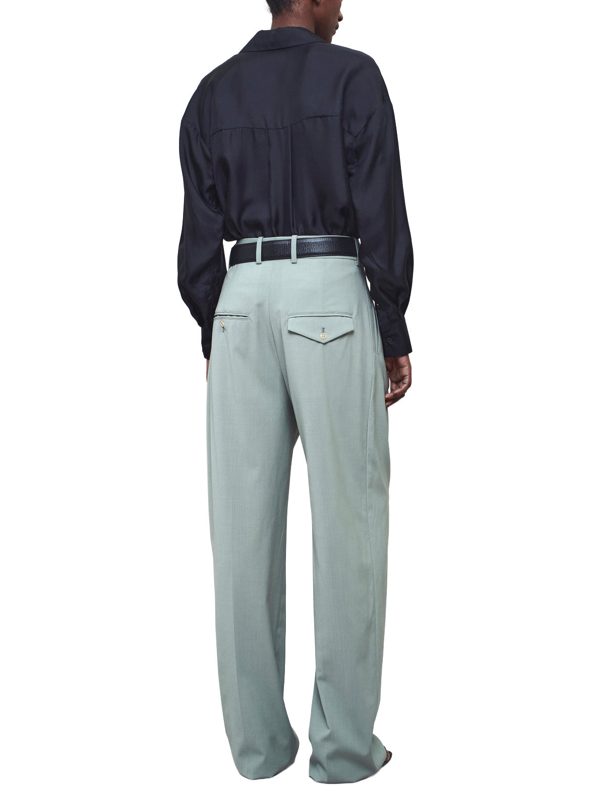 Relaxed-fit pleated trouser in sage paperweight wool. Impeccably tailored mid-high rise trouser. Elongating double pleated crease front leg and side seam pockets. Two button-close back pockets. Wide looped waistband. Pair with a crisp button down or slinky knit for effortless wardrobing.