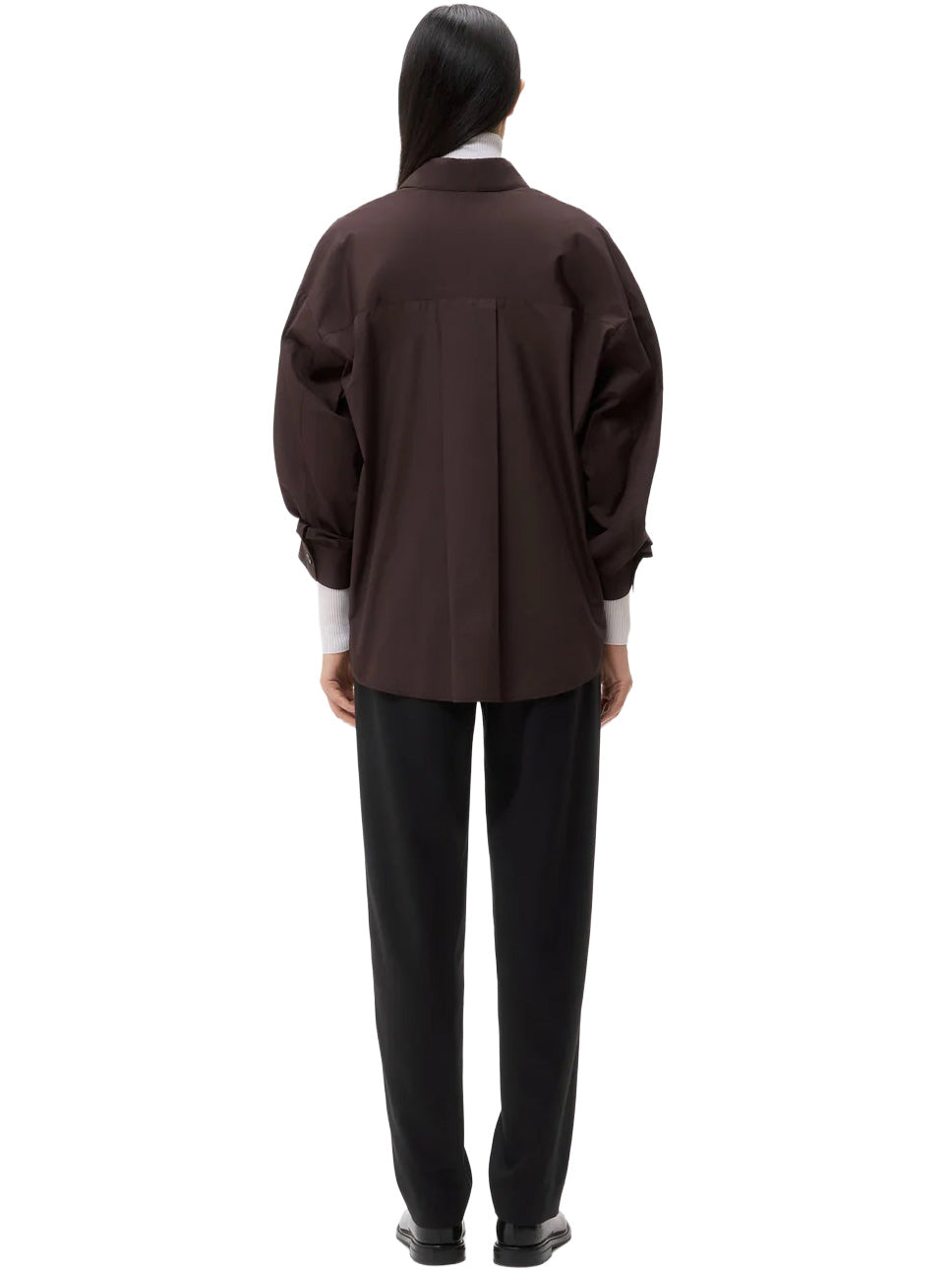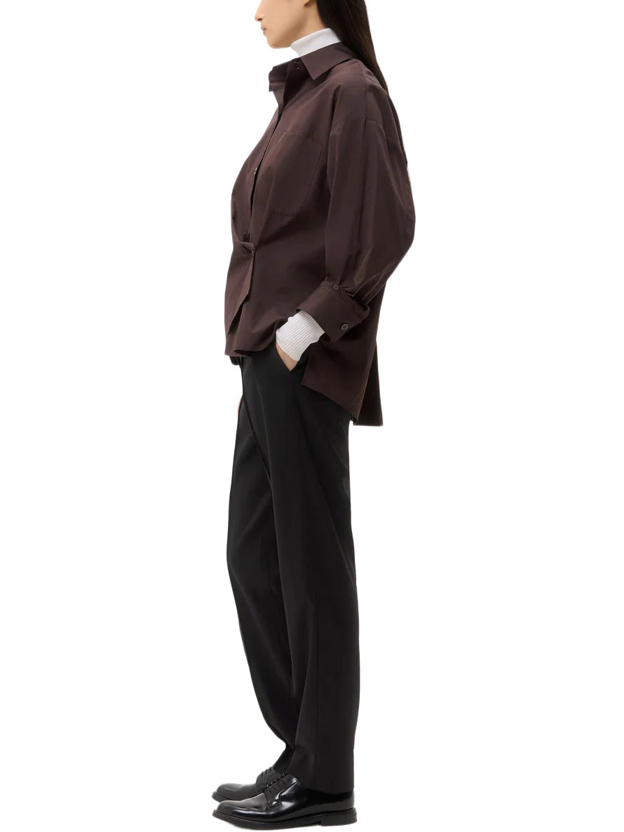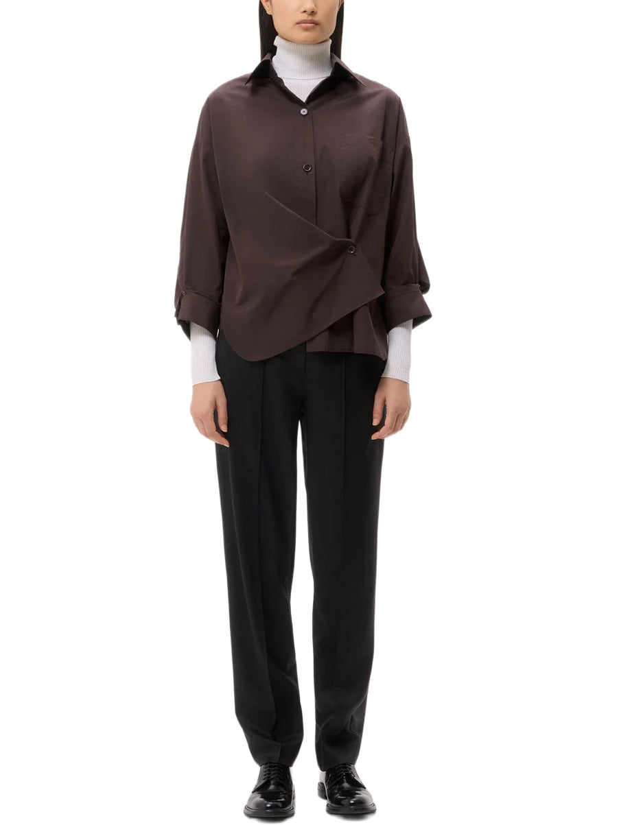 Oversized button down shirt in cotton poplin. This fabric is a smooth, more structured poplin, in a plain weave, developed for effortless wear. The Earl is a relaxed shirt featuring an asymmetric button front. Complete with a spread collar, chest patch pocket, back yoke, box pleat at the back, and single roll button cuffs.