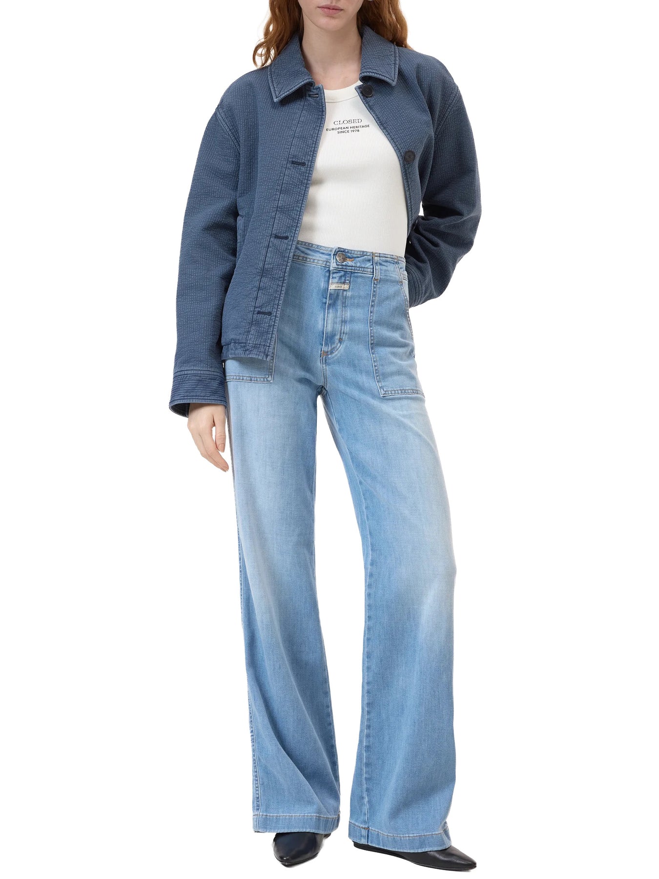 Aria Jeans are made from high-quality Candiani stretch denim crafted from regenerative cotton. Made in Italy, they are distinguished by exceptional wearing comfort. The jeans feature a high-rise waist, a flared leg, and front patch pockets.