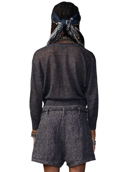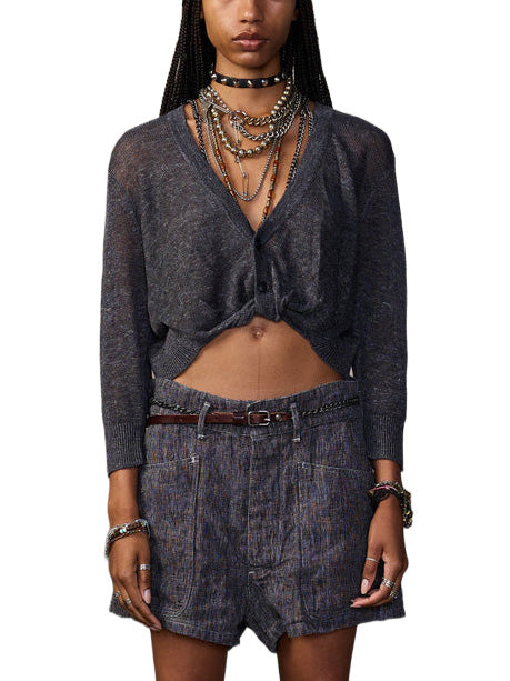 Linen cardigan with a twisted, continuous hem that wraps over itself for a unique shape.