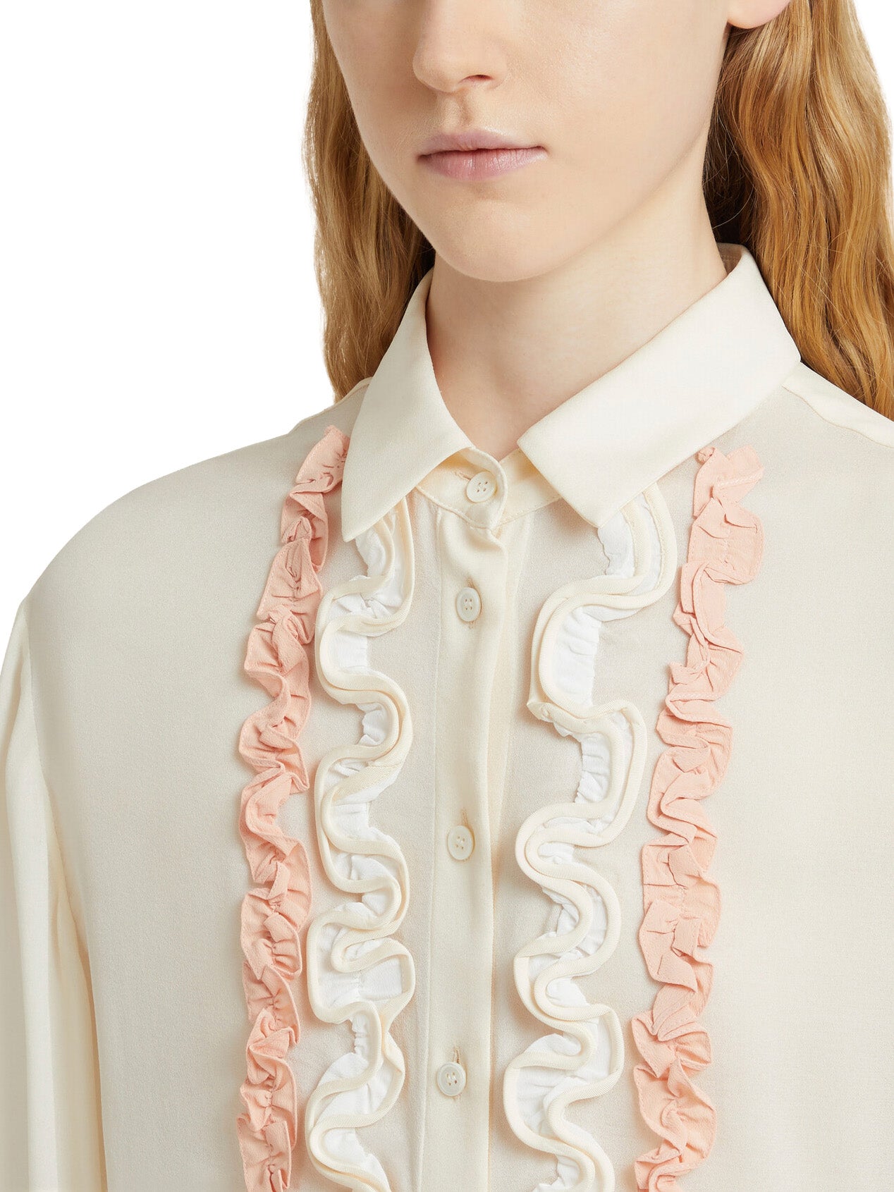 Long-sleeved shirt made from matte silk georgette with a refined grainy texture. Delicate contrast ruffles on the front. Regular fit and button closure. Made in Italy